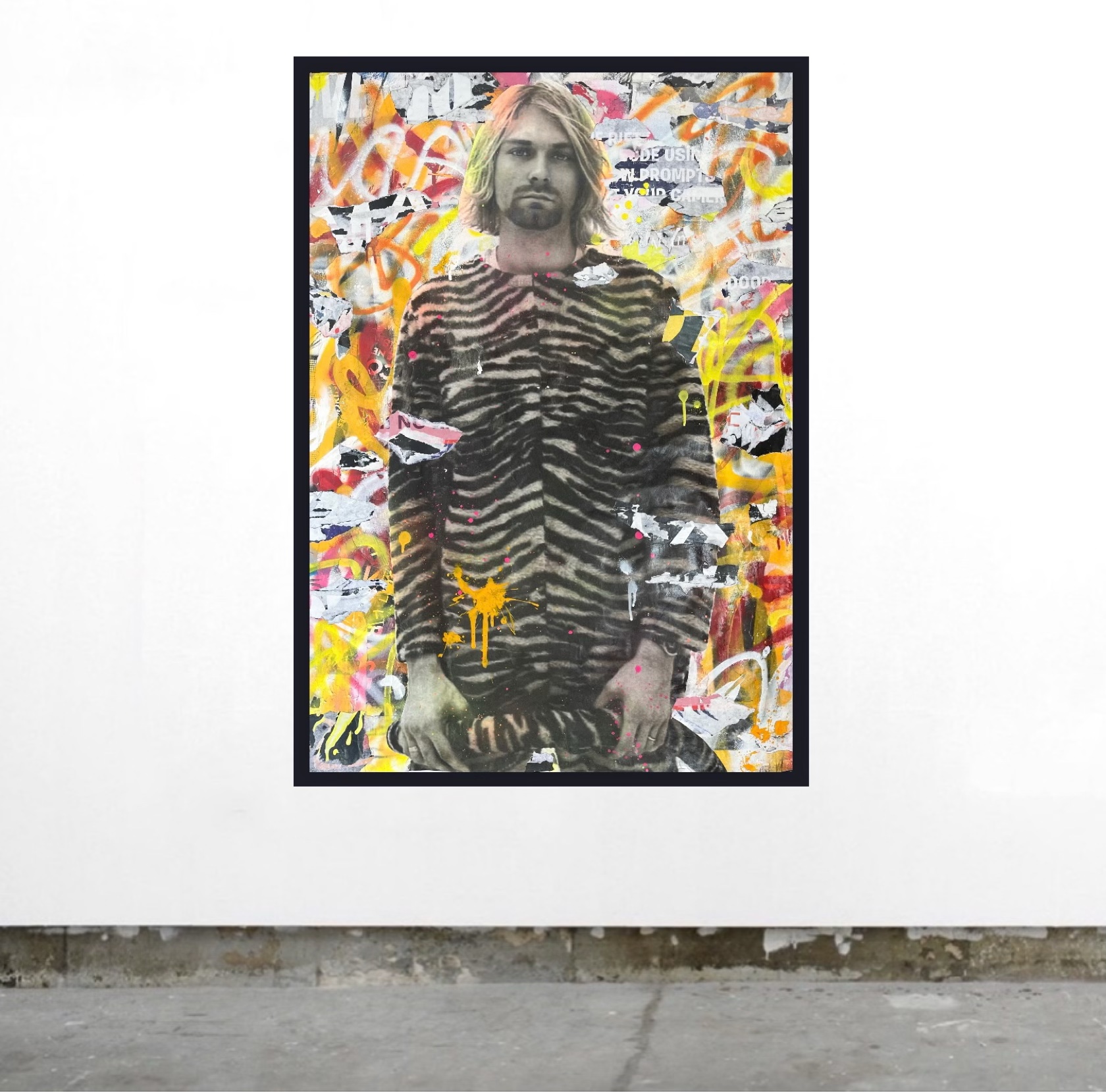 The main Image of on Kurt Cobain  was then added and then further overlaid with layers of paint and street posters to give a worn rustic appearance.