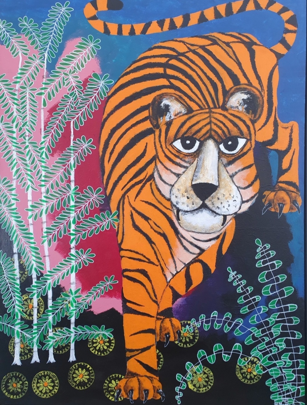 In May of 2024 I travelled to Bali for a month’s holiday. Like so many before me, I fell in love with the Balinese people, culture, colour, food and way of life. We had so many wonderful and memorable experiences in Bali and visiting the Bali Zoo was one of these. I hated to see him caged – but the presence and strength of the male Sumatran Tiger at the zoo absolutely took my breath away and I knew I had to paint him.