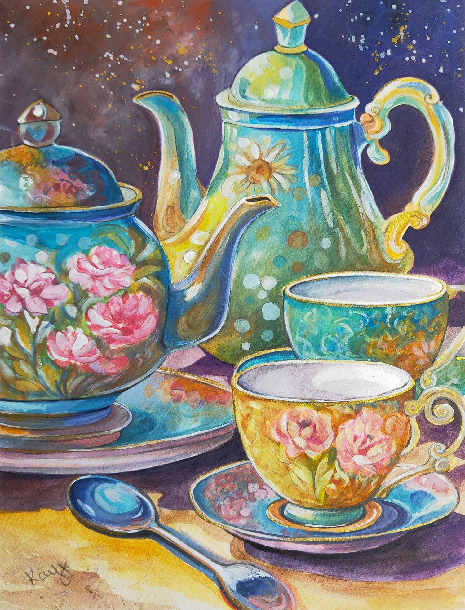 Time for Tea by Kay Shanley -This original watercolour painting captures one of Kay’s favourite daily activities, drinking tea! It’s particularly delightful when enjoyed from a vintage teacup. It adds a special touch and reminds her of growing up in England.