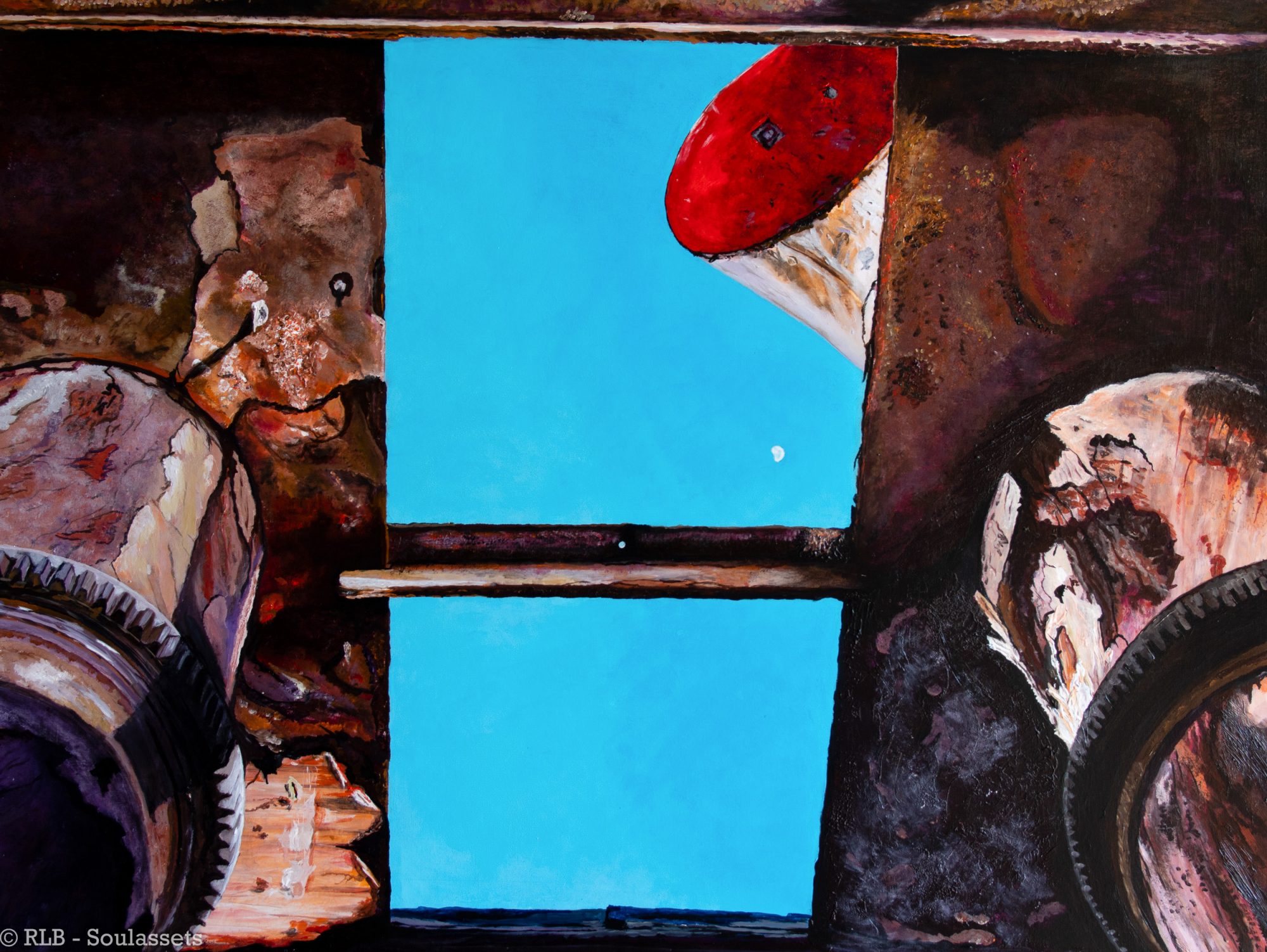 In 1985, at Trial Bay NSW, I had spent a night to remember camping in the remains of the ferry. I awoke from my dew covered sleeping bag to a bright blue sky, red funnel, and wanning moon. Koondooloo is an artwork of texture, shape, and colour by featuring two large air vents from the ship. The large cogs remind me of an old watch while the metal rust barnacles look like seashells washed up on a beach.