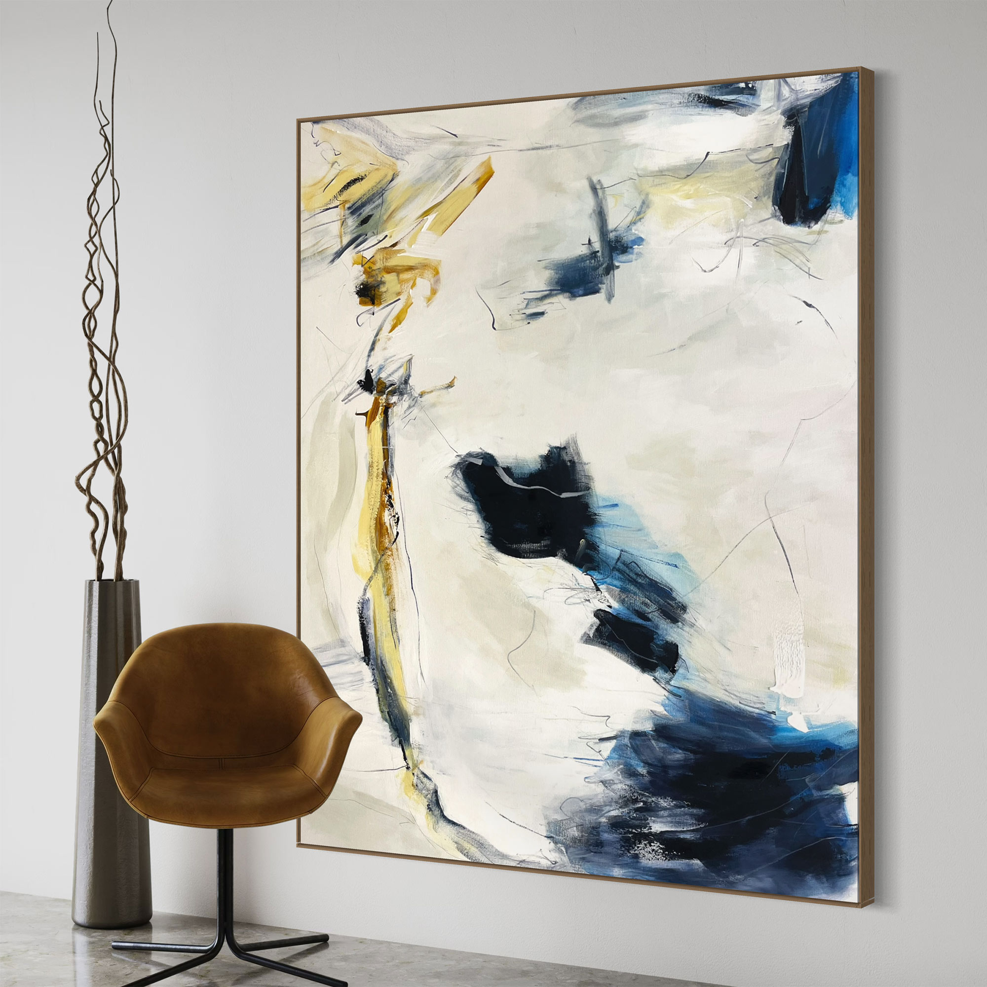 This stunning piece combines complex mark making and texture with a beautifully balanced palette of ochre, beige, white and neutral tones, grey and black with a hint of green blended with a combination of moody bright and navy blue tones.