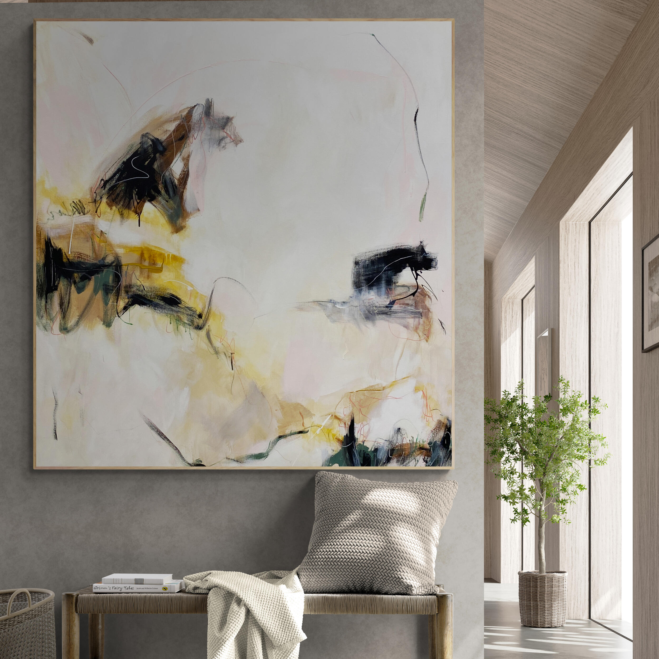 The intuitive mark making and the complex palette of warm ochre and earthy tones combined with pops of light and dark green, blush, black and grey along with the use of negative space strives to express an emotional response to nature and place.