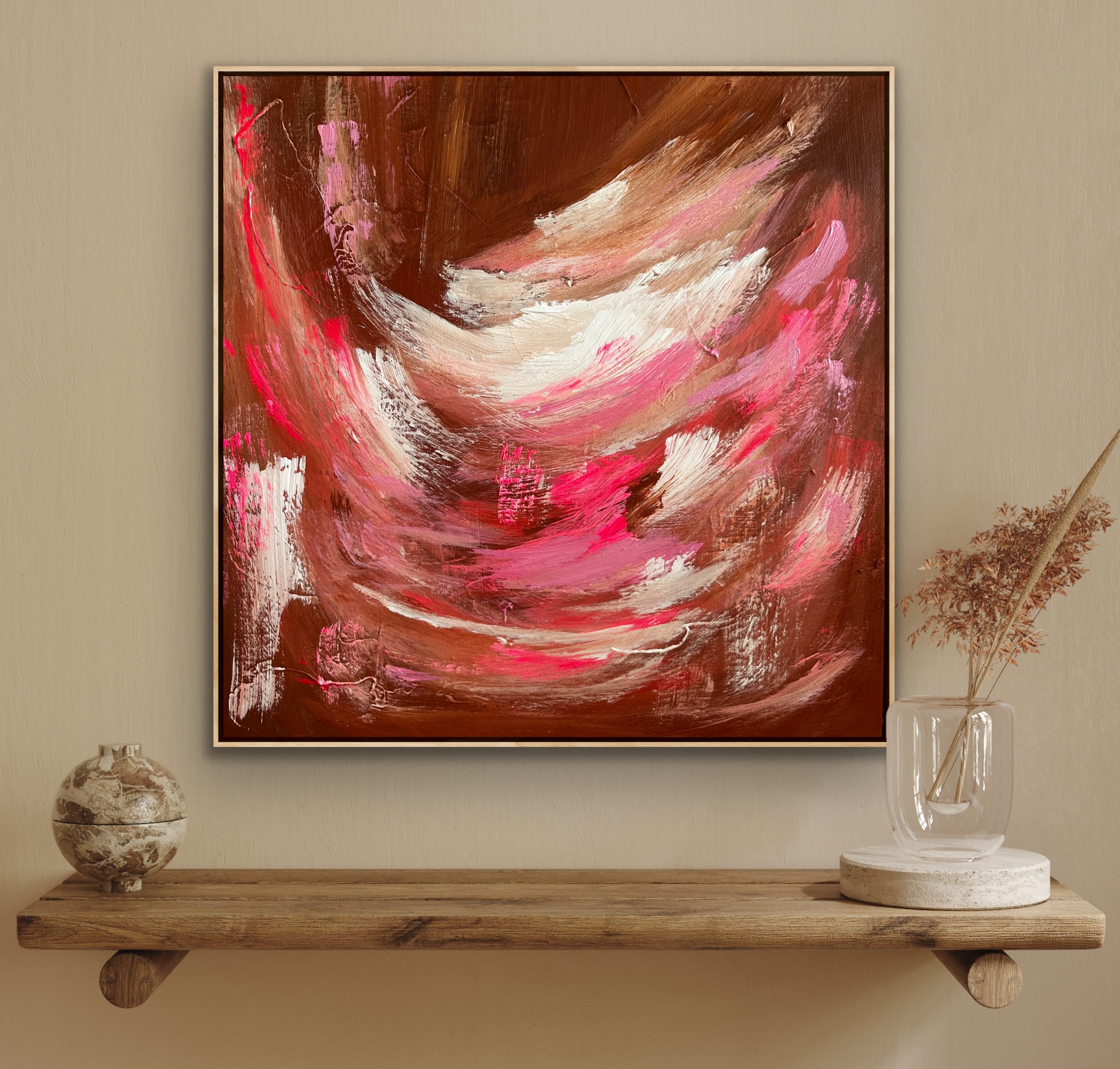 This modern palette is mixed with fun muted and fluro pink to add personality to a space. It celebrates the tapestry of the canvas and the large brushstrokes remind you to fly towards your goals. Take those shortcuts to get there.