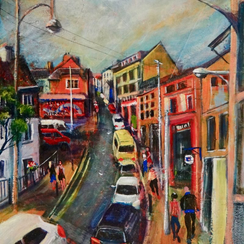 Working with fluid acrylic paint, allowing it to run and move loosely across the canvas recreates the effect of weather on the escapements, rainfall flowing through the rocks and finding its path across the land below. The organic concentric circular patterns loosely mimics the growth rings of trees, while also appearing as pools and puddles of water – pulling the viewer into the distance.