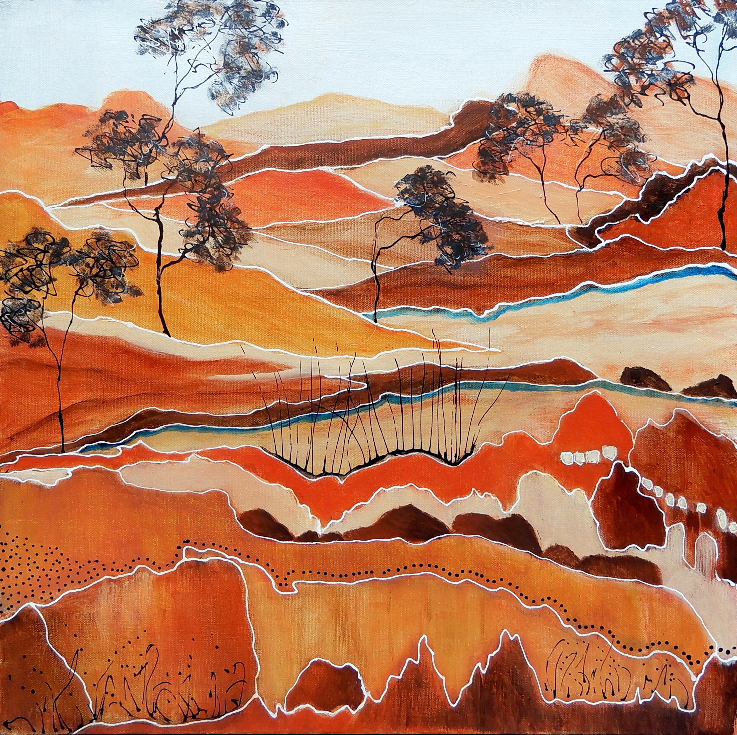 Inspired by country in the NT, this bold, bright painting explores the rhythms and colours of the landscape, rich with hills and ridges, and vibrant earthy tones.