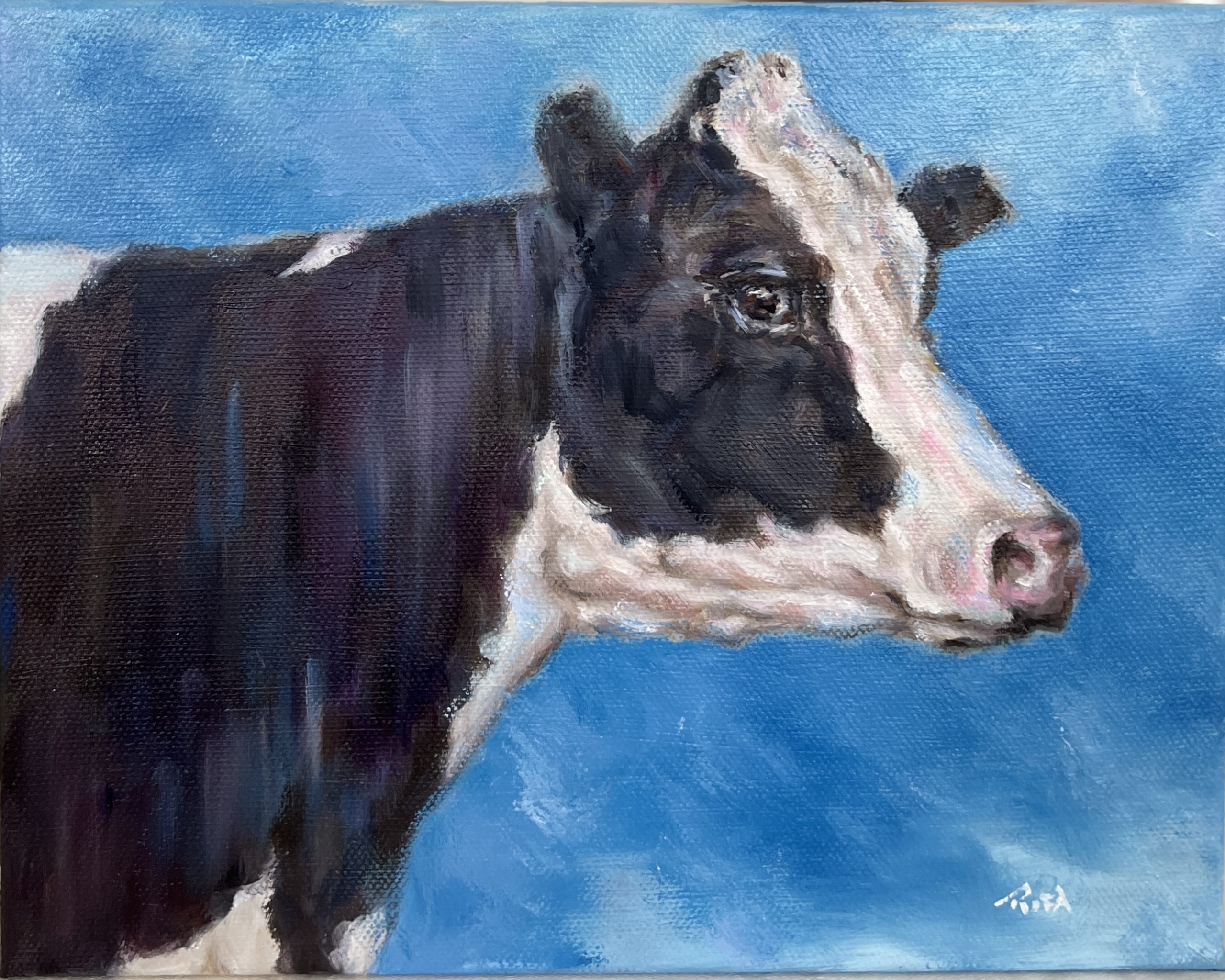 This charming painting captures a tender moment with a black and white cow beneath an open blue sky, gentle white clouds drifting gently behind him. At first glance, he feels calm and peaceful. But look a little longer and you’ll notice something more — his eye gazes into the distance, yet somehow meets yours too, as if he is quietly observing the world while pretending not to be noticed. There’s a softness in his expression, a gentle curiosity, and a quiet strength that feels deeply comforting. This cow doesn’t try to impress. He simply stands there — honest, gentle, and quietly present. Unframed.