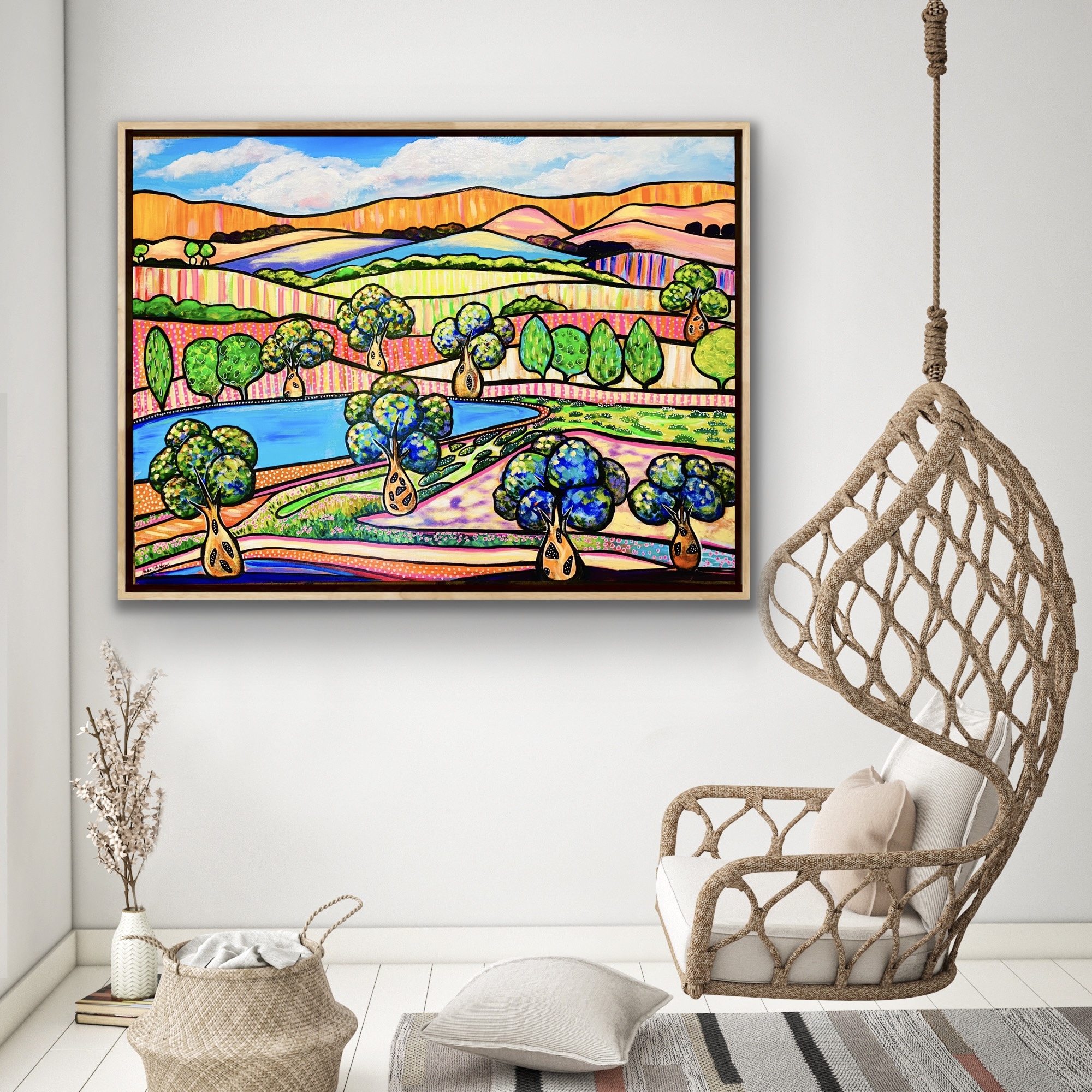 A modern, stylised, impressionistic landscape artwork, full of brush strokes and vibrant acrylic colours. Inspired by a colourful country of ancient escarpments and bottle tree timeless mojo intrigue.