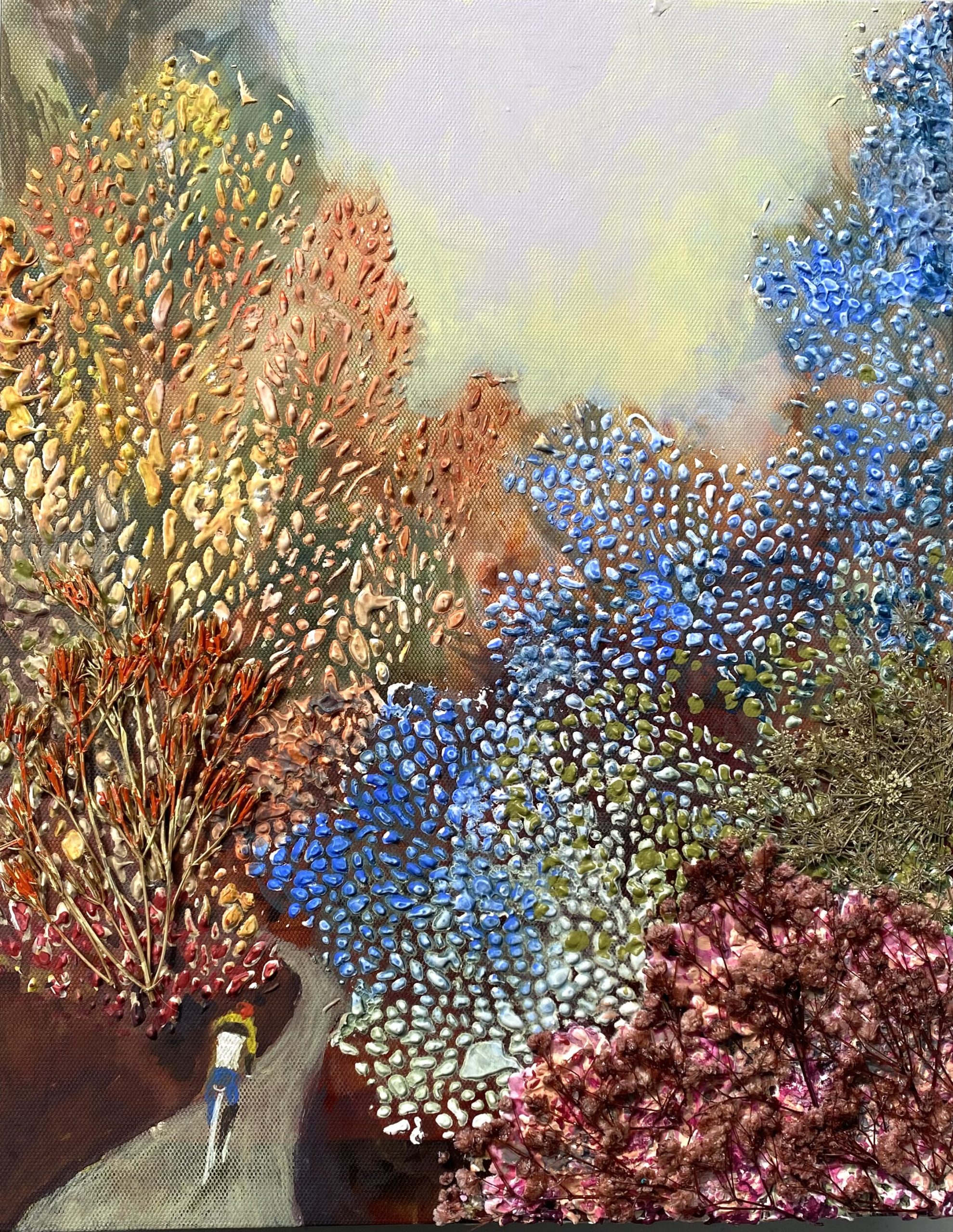 Created using mixed media, the artwork combines plaster and acrylic paint to bring the scene to life with rich textures. The textured layers evoke the tactile essence of nature—the uneven trails, the rustling leaves, and the gentle undulations of the terrain. Each stroke and material choice reflects the vibrancy and dynamic interplay of colours found in the natural world.