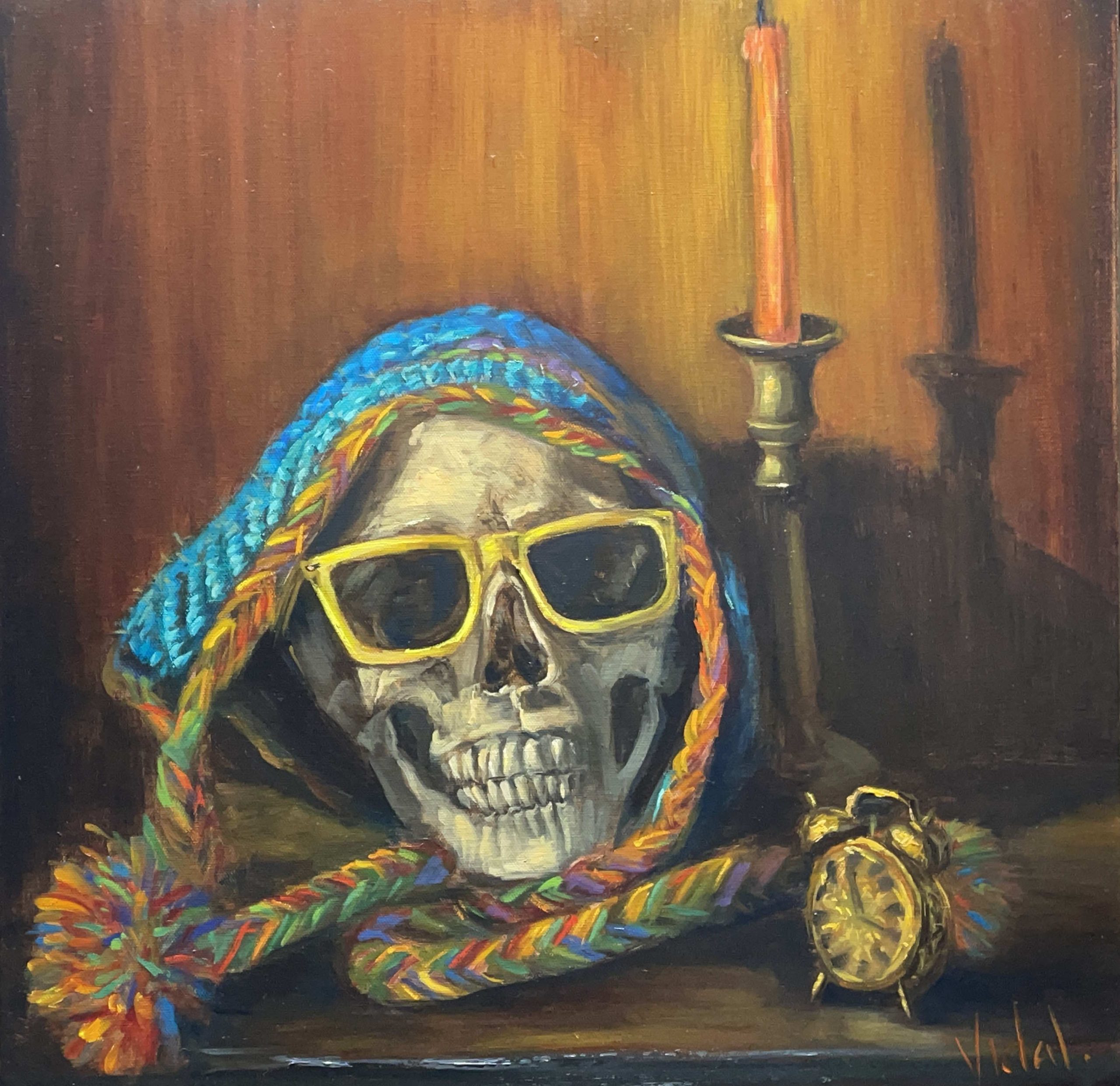 A still life oil painting that combines vibrant elements with symbols of mortality. At the centre is a human skull adorned with a playful, colourful knitted cap and yellow sunglasses, juxtaposed with a brass candleholder and an antique alarm clock. The bright, whimsical elements contrast starkly with the macabre nature of the skull, evoking reflections on life, death, and the fleeting nature of time. The painting invites viewers to consider how we embrace life’s impermanence, perhaps with humour, vibrancy, or nostalgia.