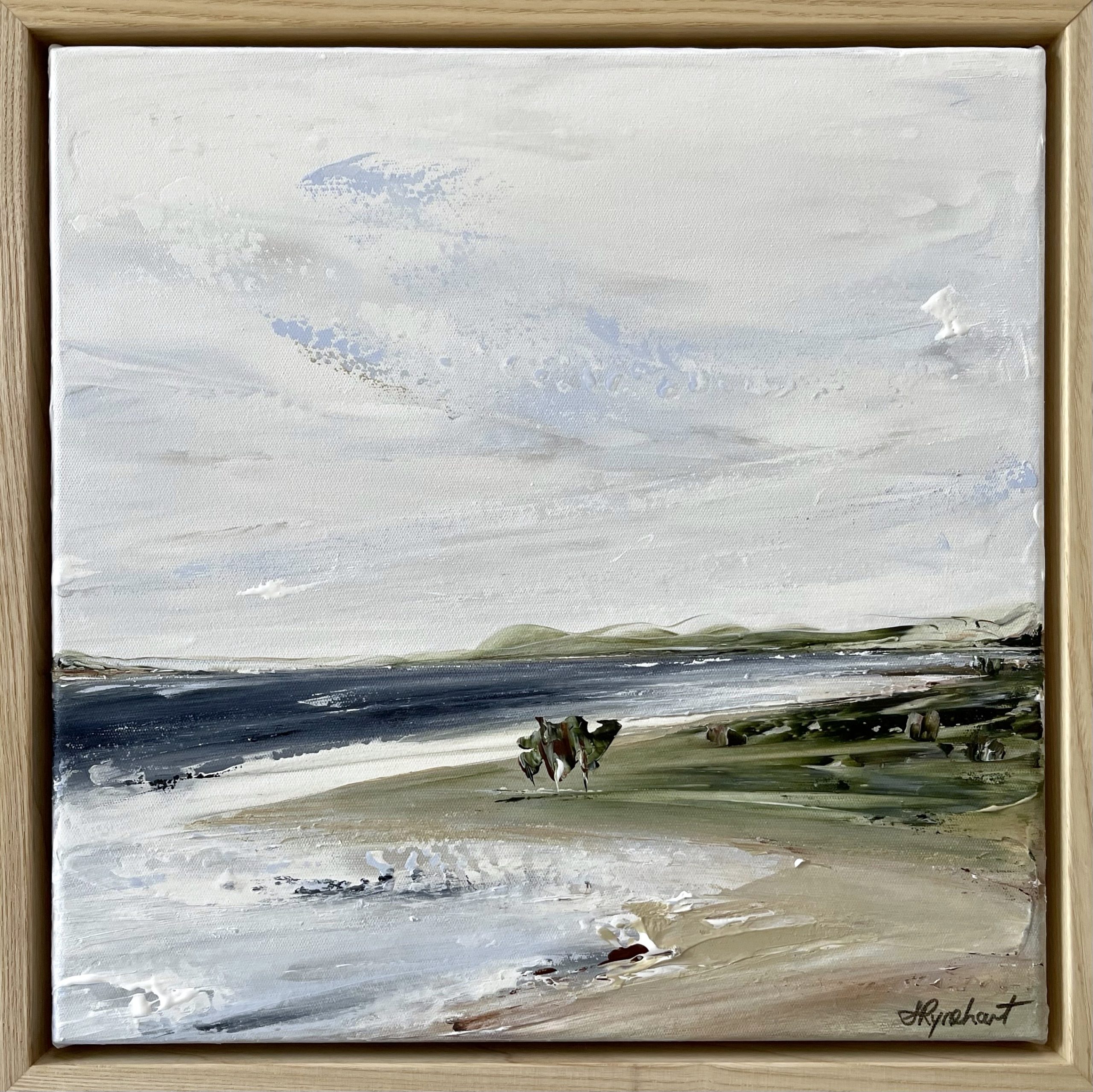 Created with palette knives, this little seascape of blues and greens, is inspired by treasured times together at the coast. It is framed in a natural timber frame, is satin varnished, and will come with a COA.
