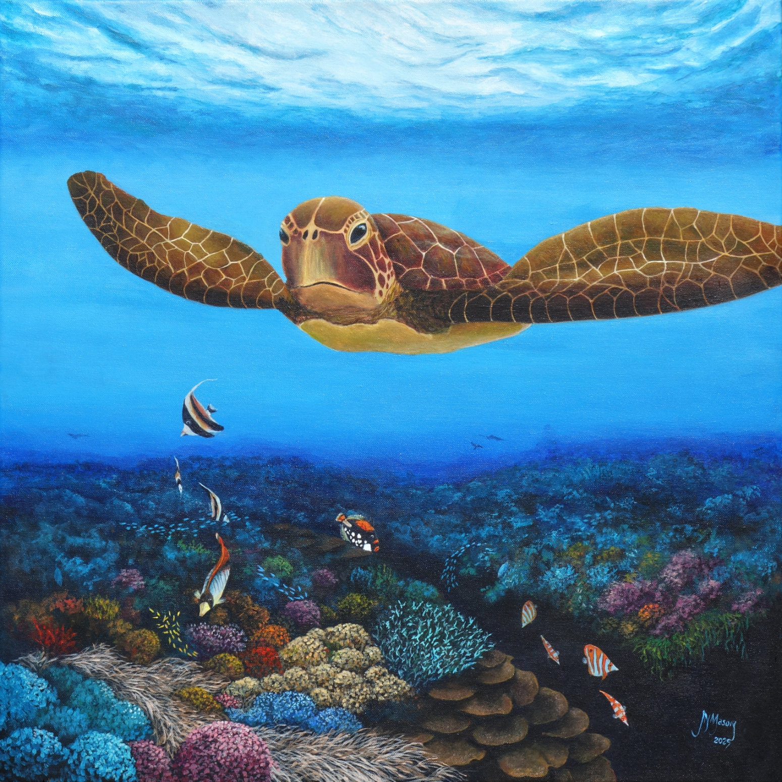 Sea Turtle Tina gliding across the Great Barrier Reef. A Sea Turtle in an imagined Great Barrier Reef scene with various reef fish. Beaked coralfish, Lined Butterflyfish, Morish Idol fish, and Triggerfish, all native to the Great Barrier Reef.
