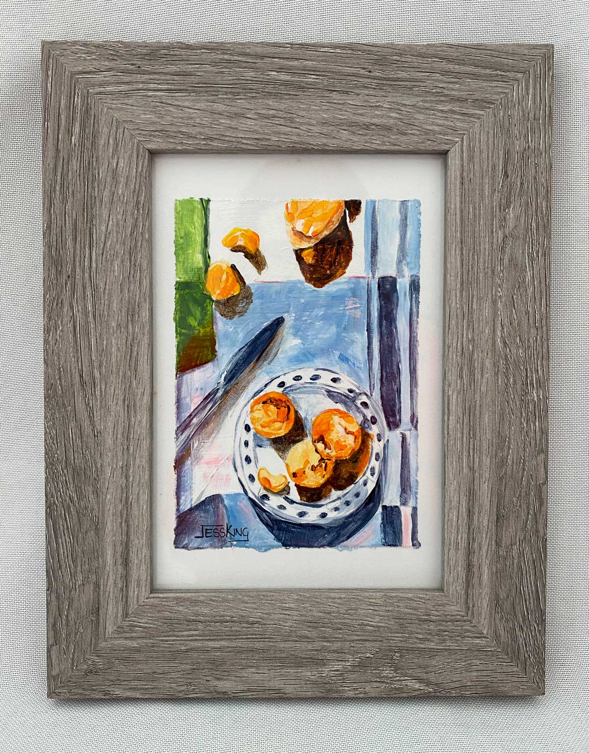 Bring a splash of whimsy to your kitchen with this playful original still life. Featuring a charming tablecloth, with a plate of oranges, this tiny treasure captures everyday magic with a fresh and joyful vibe. Perfect for brightening up any space with a touch of artistic fun.