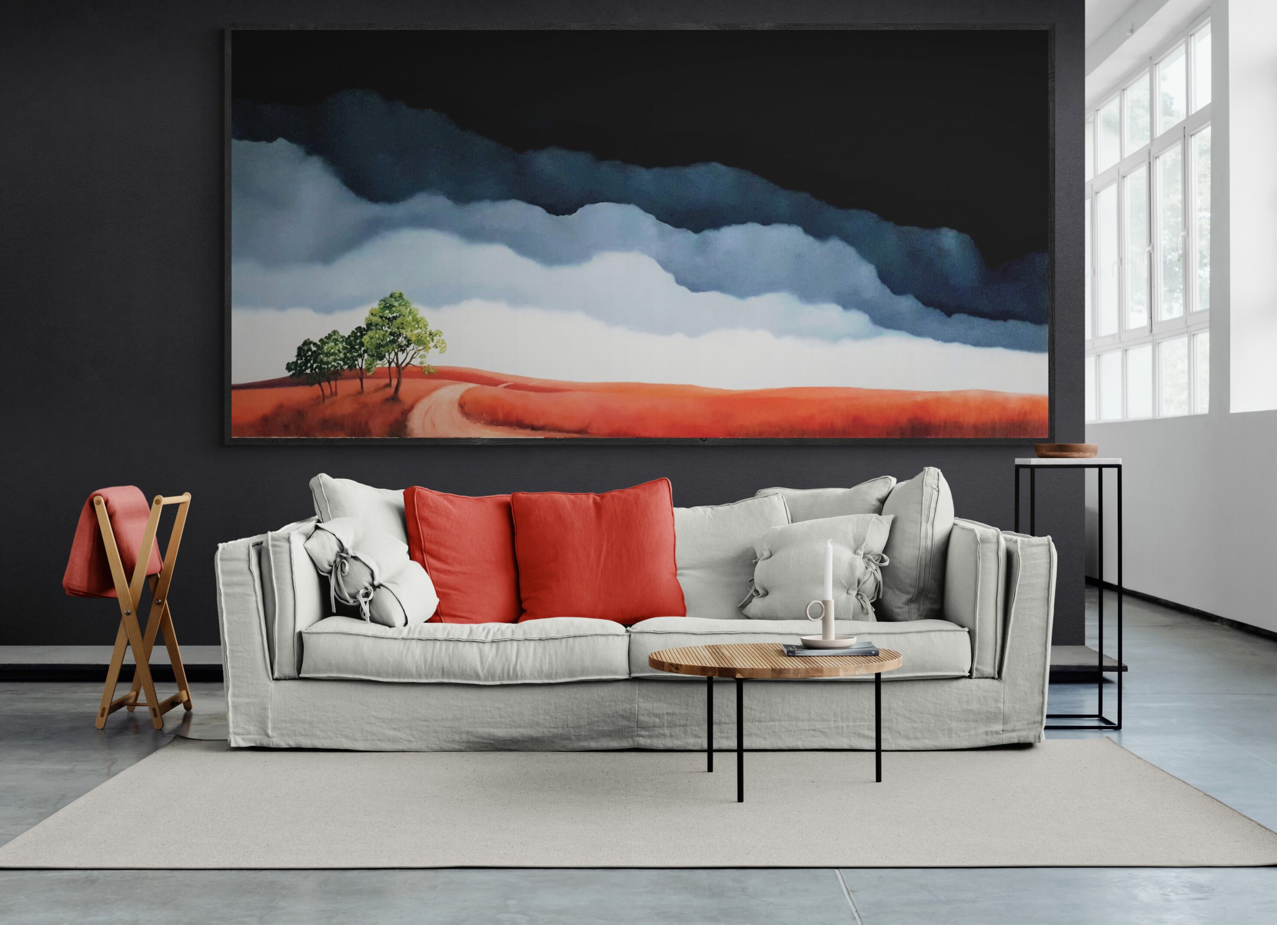 This is a huge landscape painting with deep orange hills set beneath a dark stormy sky.
