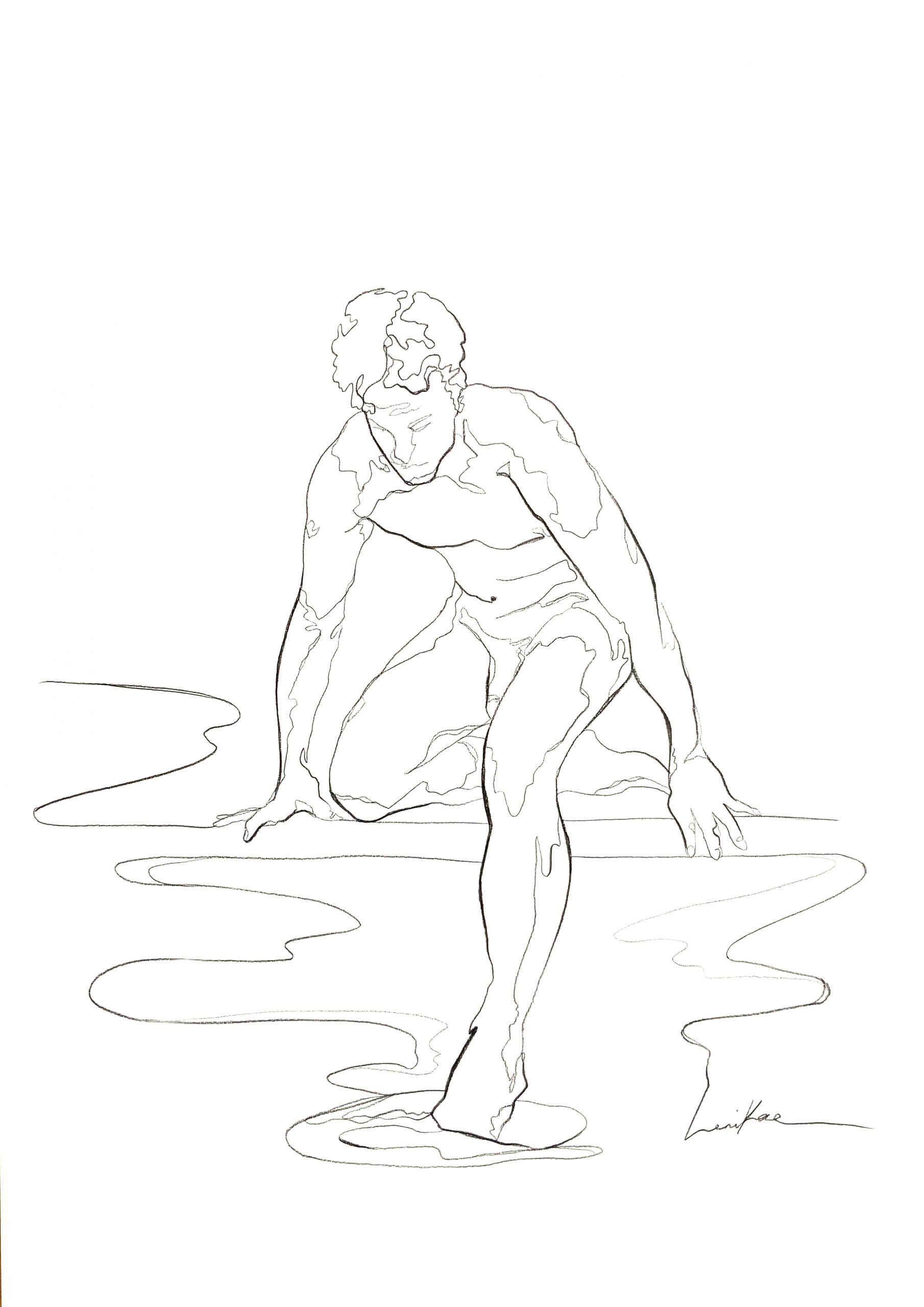 A line art drawing by Sydney artist and illustrator Leni Kae (c). Featuring a nude male with a toe in the water; it symbolises the journey of discovery, and taking a moment to appreciate the beauty of life’s simple pleasures. Minimalist black and white design.