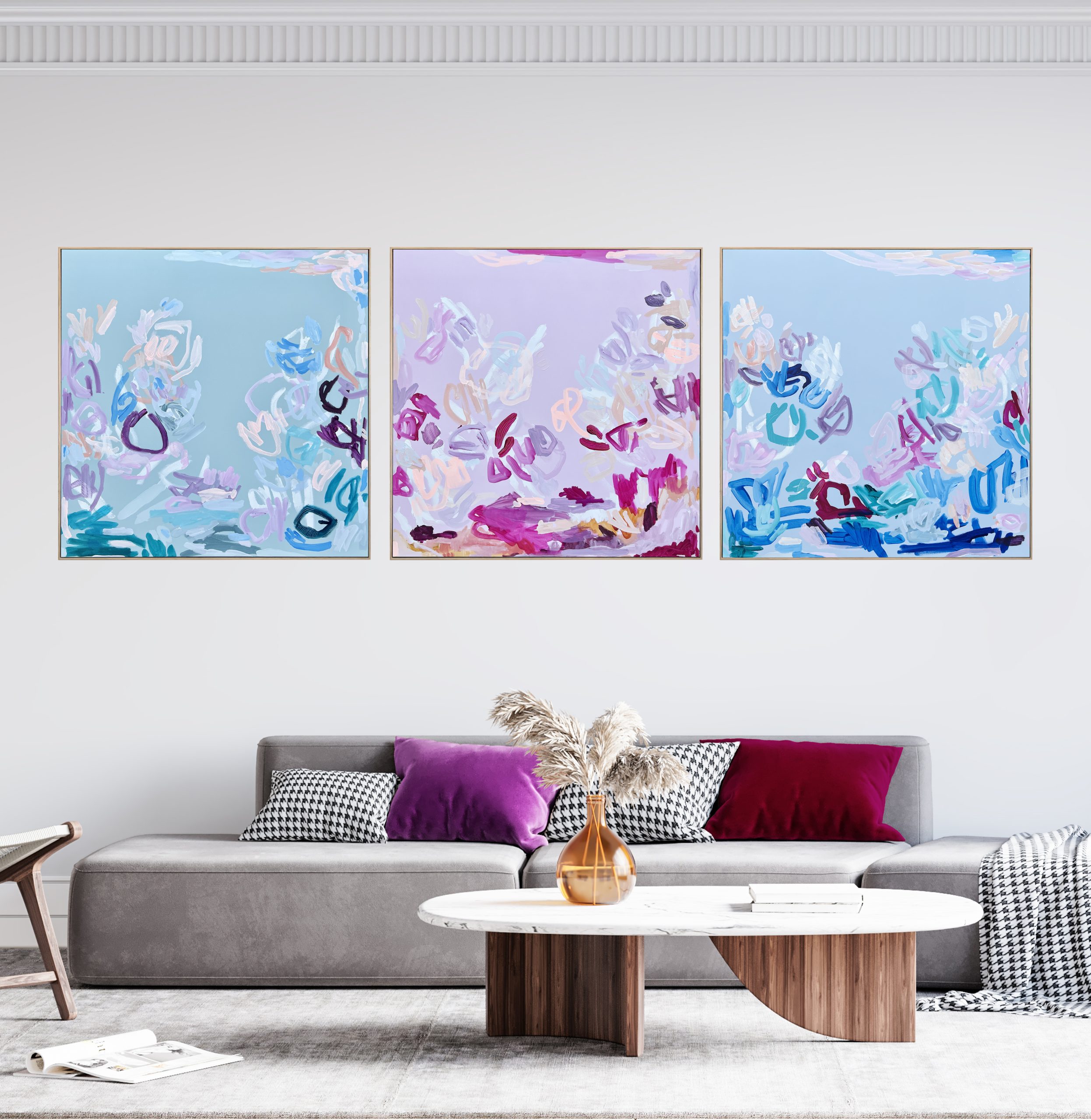 A gorgeous colourful triptych. Each piece measures 112 x 112cm to make up a 336cm wide diptych. It will span a little wider depending on how much room you leave between each piece when hanging. The pieces can be hung in any order.