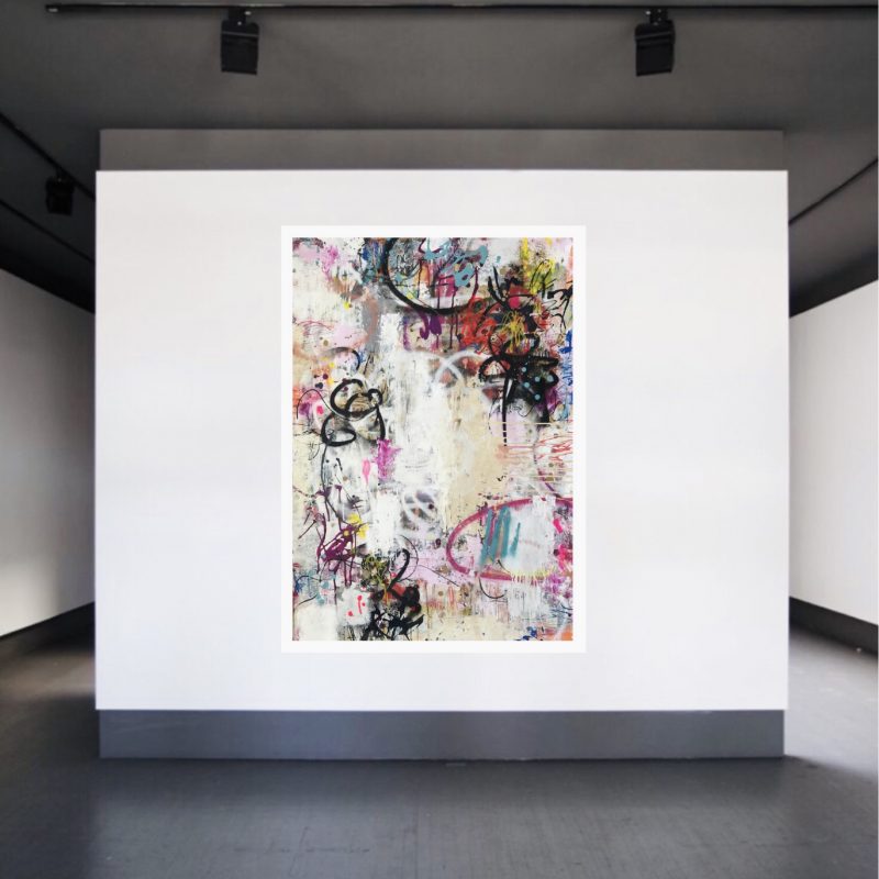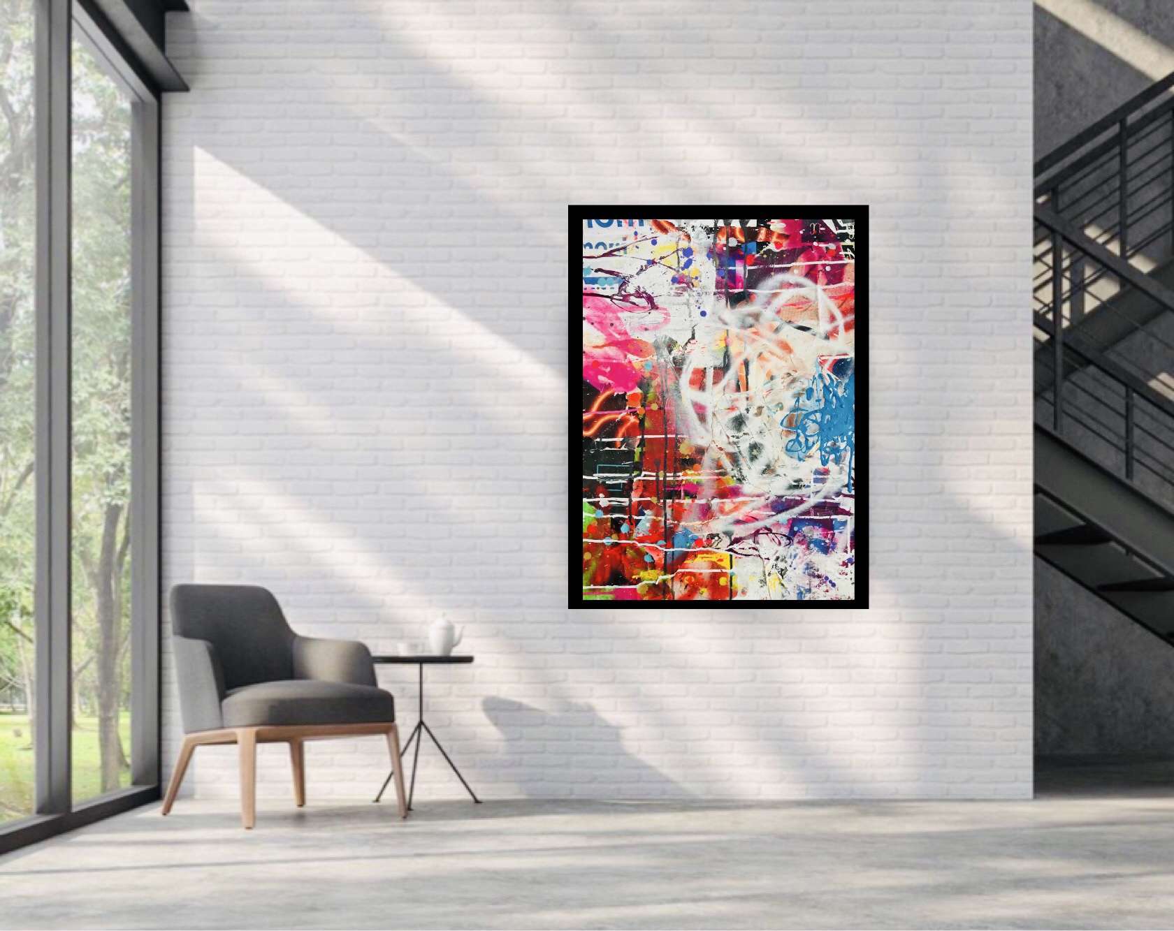 This artwork has a very textured finish created by built up layers, paint splatters and torn paper, a visual effect mimicking the look you would see in the street where this effect is created over time on Graffiti Walls & Advertising Spaces. These imperfections are part of the overall look and rustic feel of the finished work.