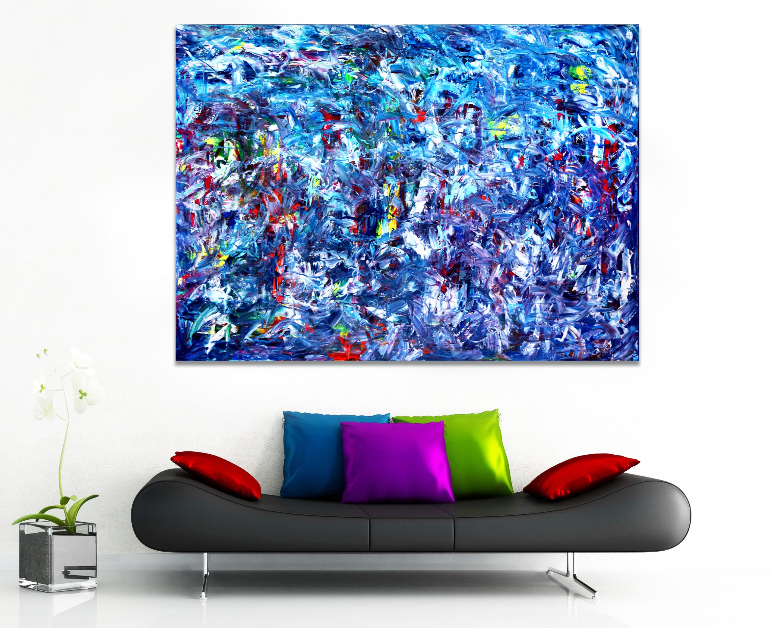 This work is painted with synthetic polymer acrylic and the surface is a professional-grade 12 oz canvas and has been sealed with varnish. Thew canvas is stretched onto an HD stretcher with dimensions 122cm height by 168 cm in width. The artwork has been painted on a larger studio stretcher and so the painting wraps around the sides (colour wrap) and so does not need framing.