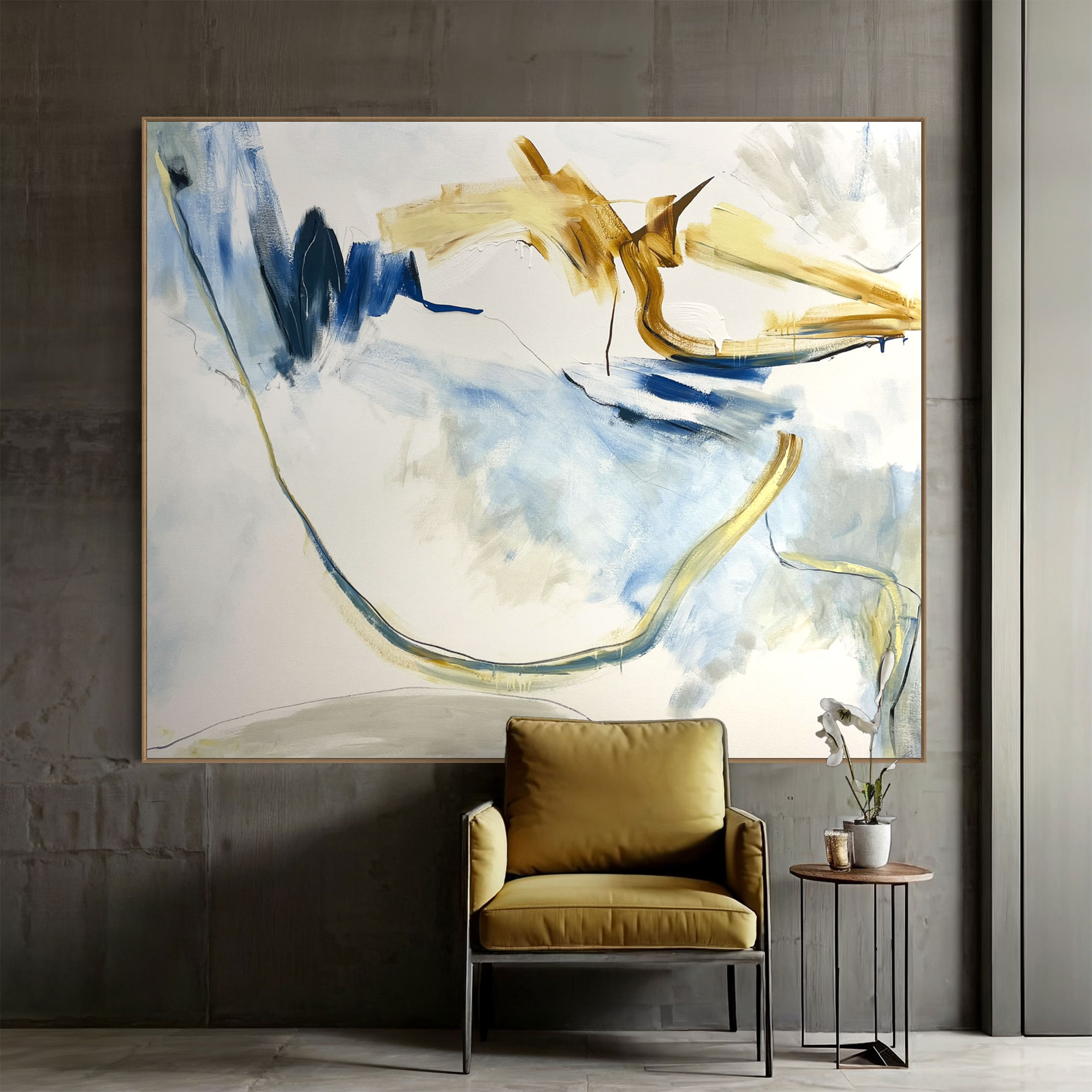 This stunning piece combines complex mark making and texture with a beautifully balanced palette of ochre, beige, white and neutral tones, green, grey and black blended with a combination of moody bright and navy blue tones.