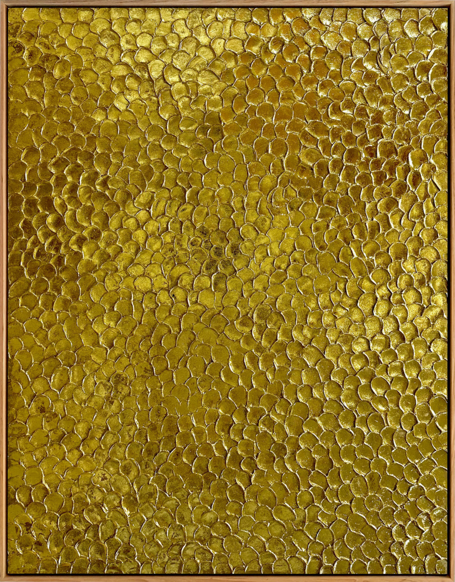 A richly tactile composition where opulence meets chaos. Layers of gold leaf and metallic paint shimmer over a rugged, heavily textured base, catching the light with every movement.
