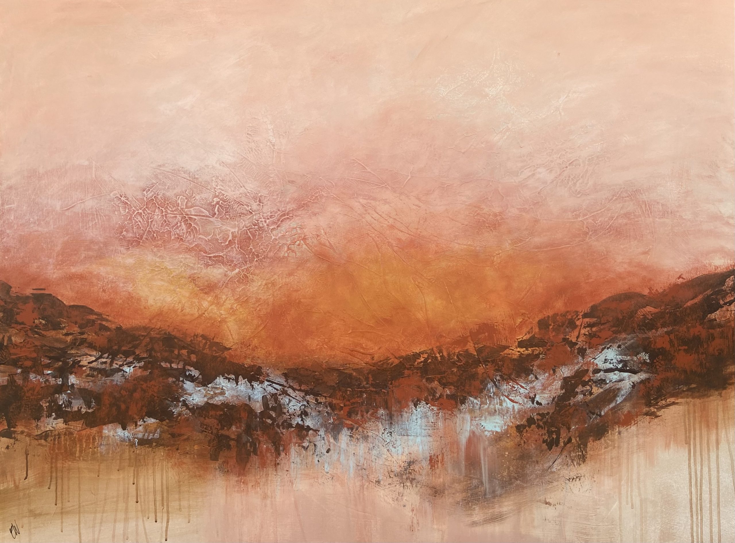 Towards Stillness by Carrie Welsh is a beautifully textured warm abstract landscape painting. 121.9 x 91.4 cm. Acrylic on canvas, ready to hang. Frame not included.