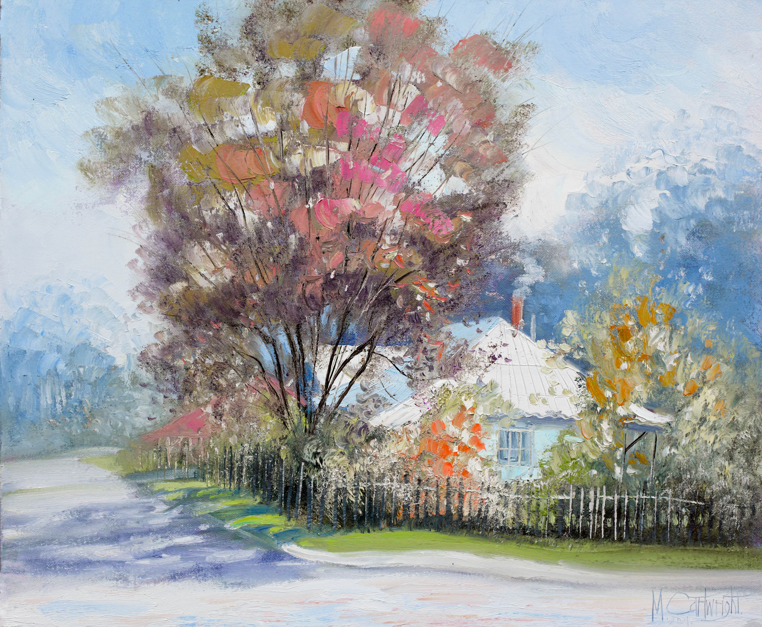 I was inspired by the afternoon light shining on these charming old houses and their surrounding gardens.The location is the beautiful tourist town of Denmark near the south coast of Western Australia. A textured oil painting spontaneously rendered using a palette knife.