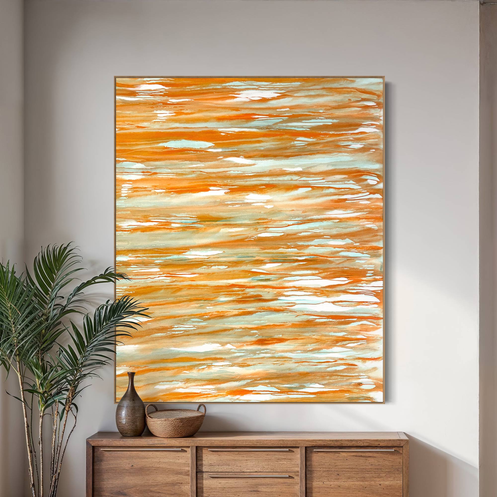 This contemporary abstract painting features complex and delicate mark making. It has a beautifully balanced warm palette of striking pale blue and green with soft earthy corals and rich orange. The imagery extends around the edges of the canvas, offering a seamless presentation, should you choose to hang it without a decorative frame.