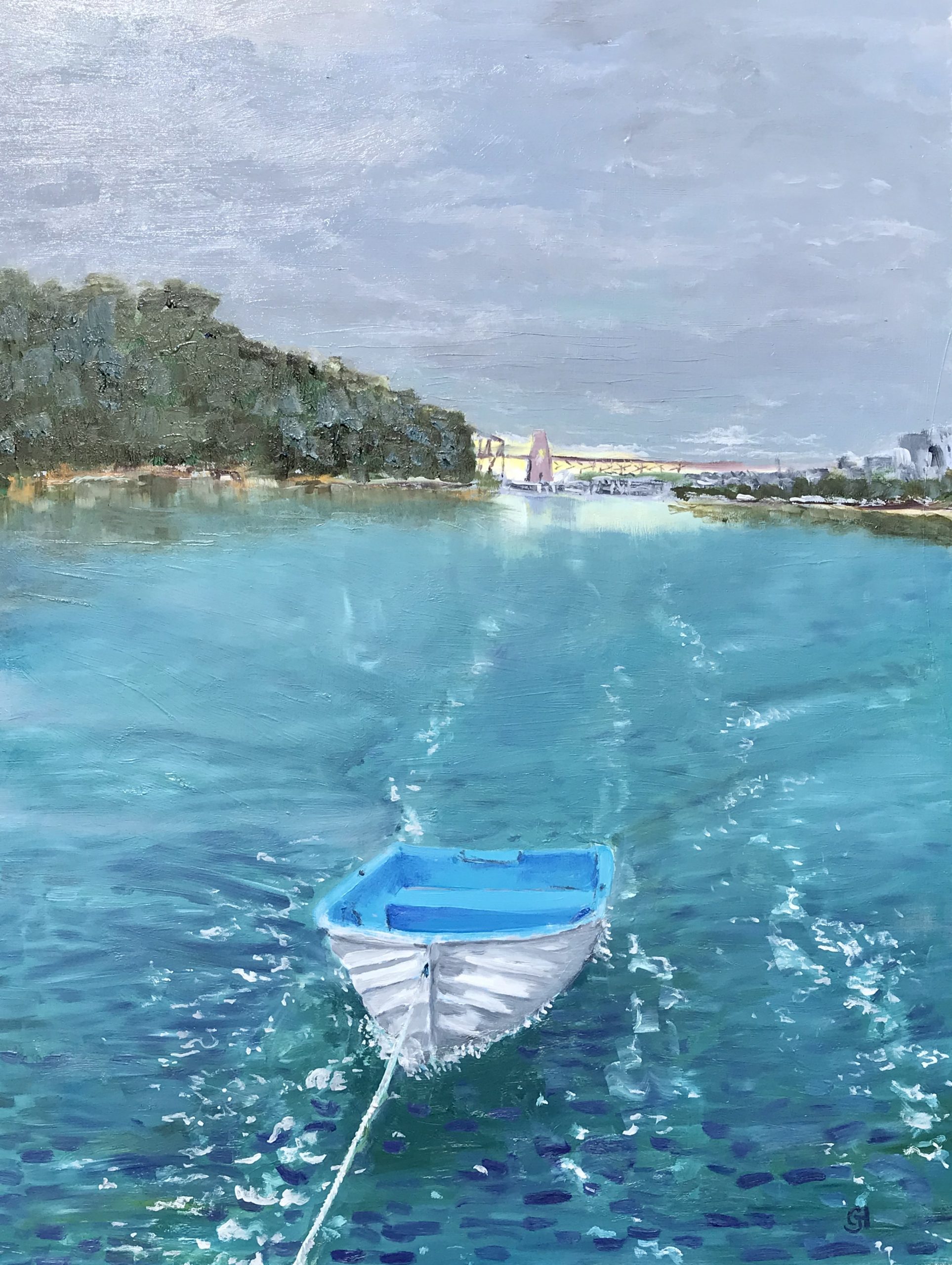 A beautiful morning to ourselves on the harbour of Australia’s most populated cityoil on cradled wood. H81 xW61x2 cm