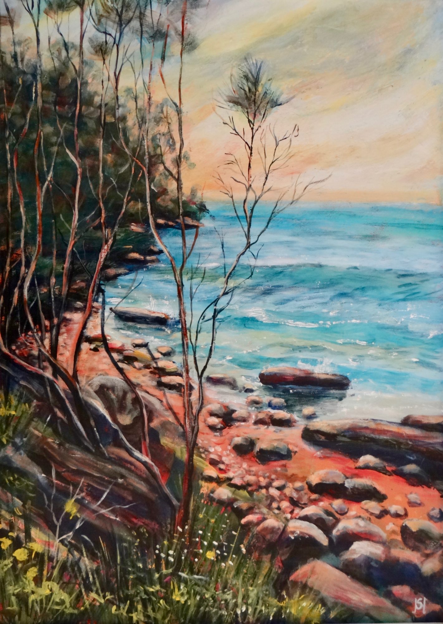 I painted it from ‘a birds eye’ view as if I was up on a high rock looking down at the beach scene with the rolling waves and rocky shoreline. The pale golden skies above the ocean create the mood of this tranquil scene.