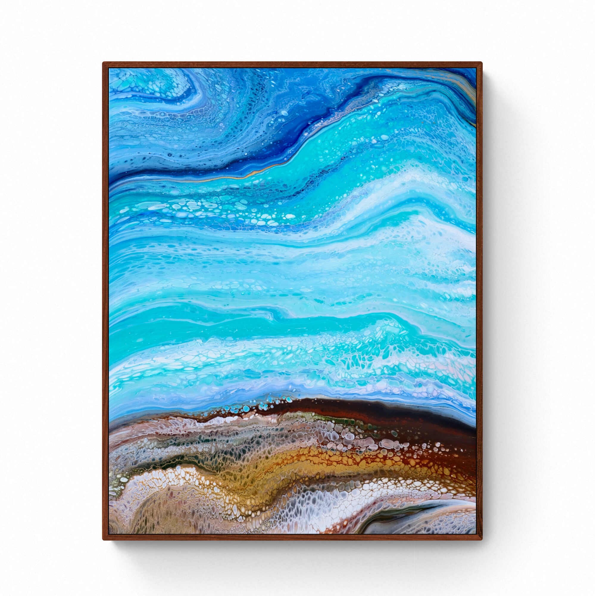 Acrylic, water and latex on stretched canvas, framed in Walnut.