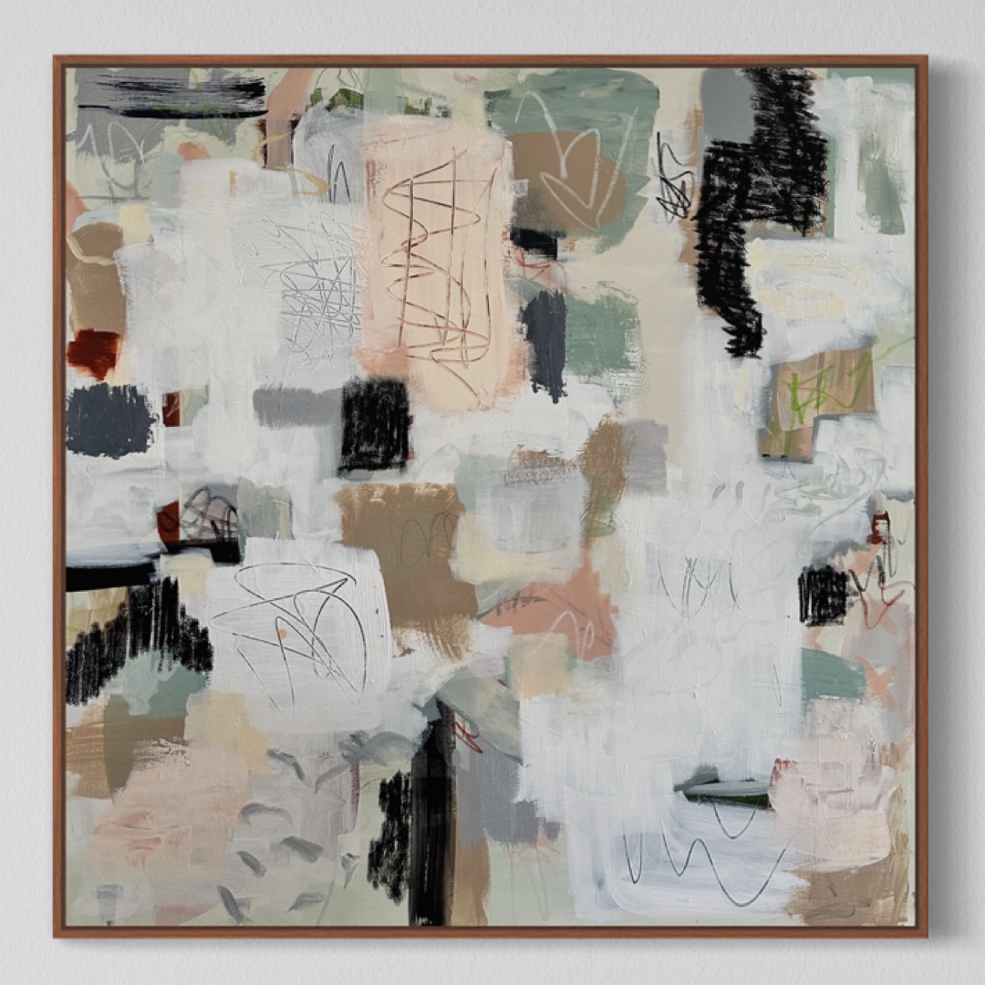 Transforma by Stefana Kachirski – a modern abstract painting that will bring colour and depth to a space- the sage, green and neutral colours will go well in a modern or classic space. Framed in stained oak.