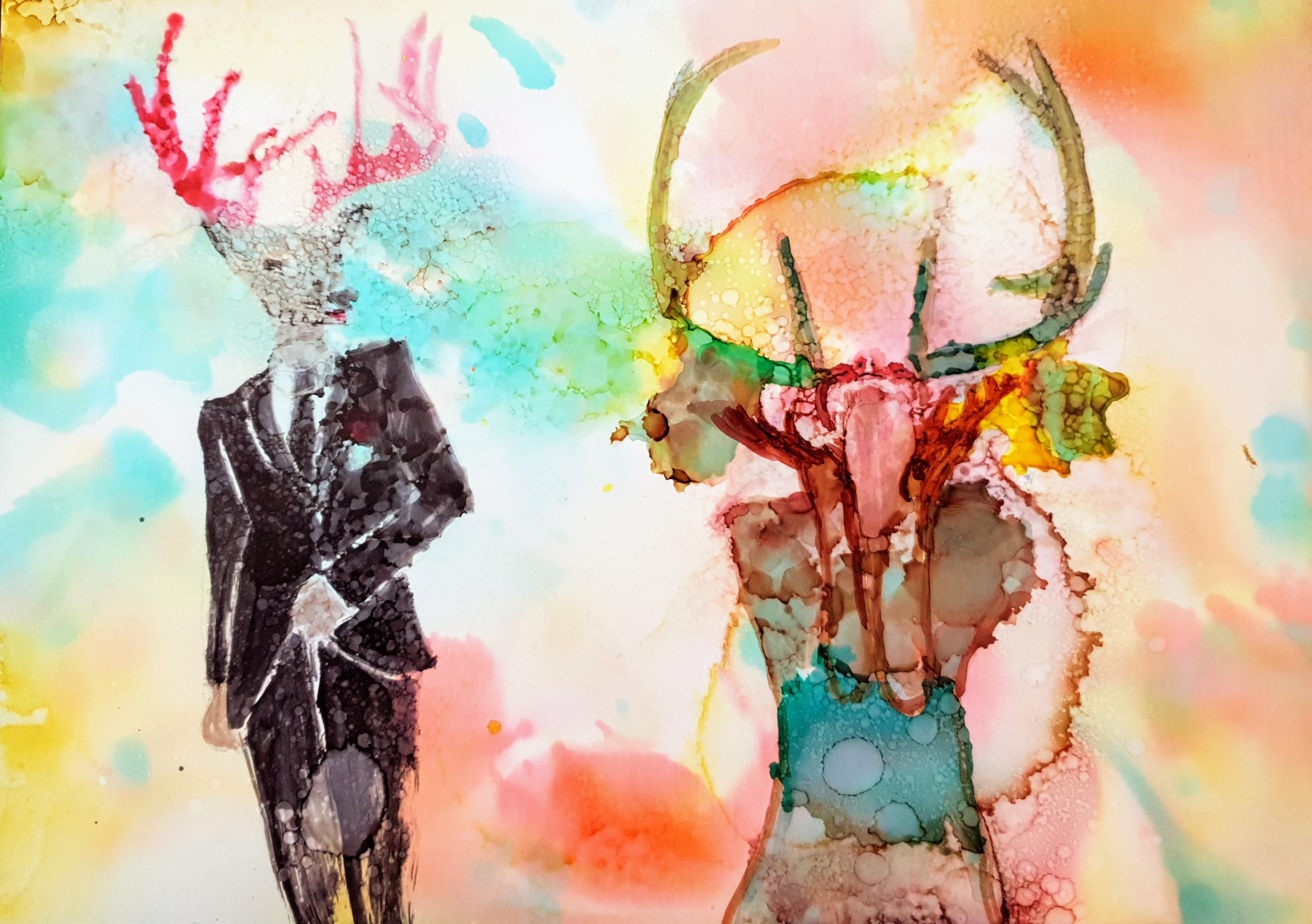 I have painted Transformation as a form of awakening, the transformation of the body into a primal version- of the female, whereas the male looks on as the animal, tricked up to appear human in form. This in a sense for me is the story-no Fairies as such, but what happens in this dreamscape is the dream. It is dreamlike and blurs the edges of reality as a fairytale does, its primal, sexual and holds promise each person possibly becoming another, each person holding the possibility that they are both of these versions of their true self.