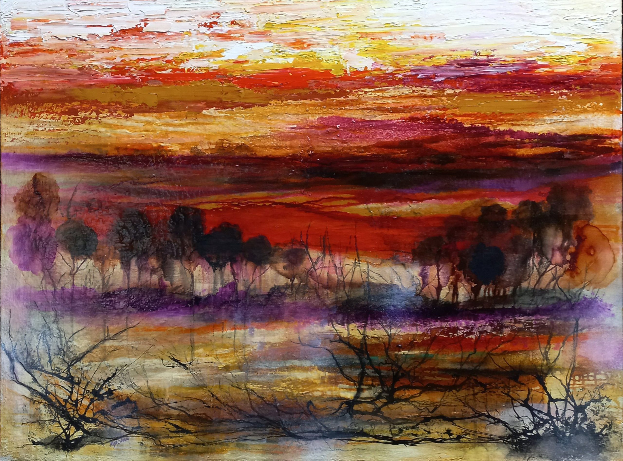 I usually paint atmospheric works and in this painting, I’ve attempted to show the filmy, hazy visual effect experienced in the heat of our deserts. The effect is solid and bold, but transient and delicate at the same time. My intention was to connect the sky, the earth and the vegetation, so there is no clear separation of any of the elements – they may even appear to merge. My hope is that this work opens up your imagination to not only see the image, but to feel the atmosphere as well – perhaps even hear sounds. The symbolism of ‘Transiently’ is therefore open-ended, allowing viewers to interpret the painting as they see it.