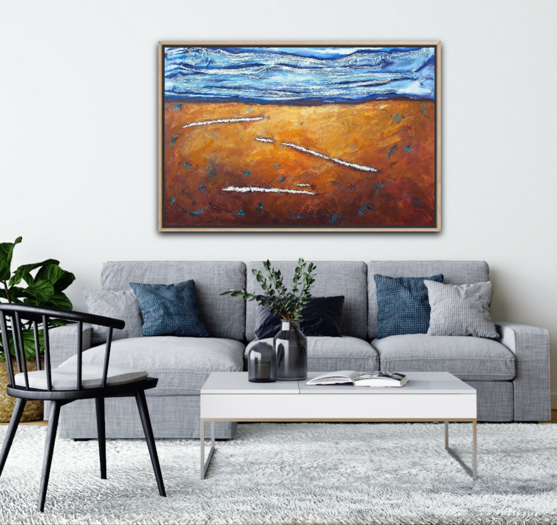 This landscape contains beautiful, multiple layers of texture and colour. Truly more beautiful in real life. It glows with rich ochres, sienna, and blues. Broad confident strokes of the palette knife are evident. Texture has been created with areas of paint and strips of canvas. It is a stunning piece which has been influenced by the great tradition of Australian landscape artist.