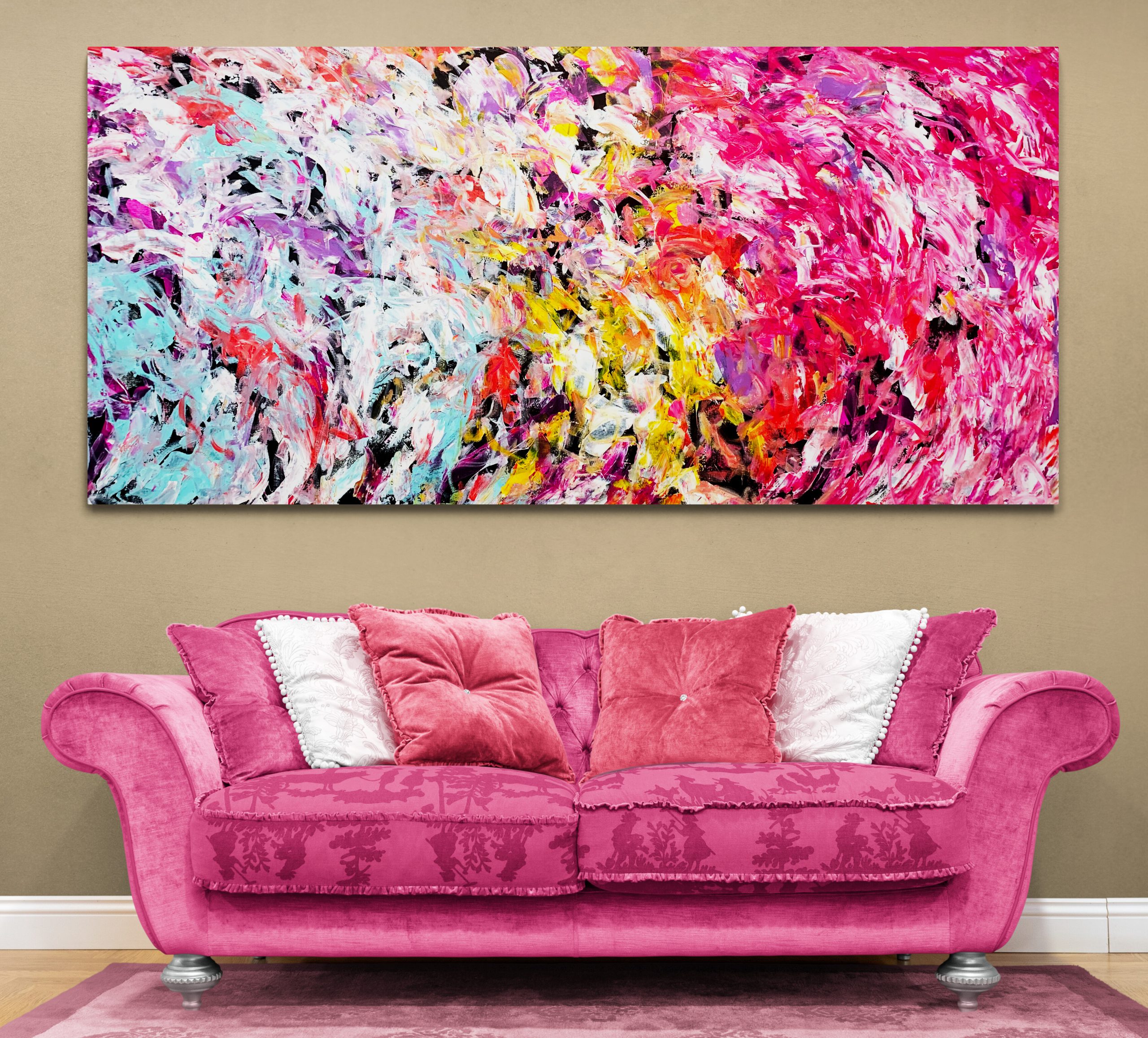 This artwork is painted on professional-grade canvas stretched and sealed with varnish. The canvas has dimensions 208 cm in width by 98 cm in height. The painting wraps around the sides of the stretcher, so the sides are painted in the same style as the surface. As such it does not need a frame.