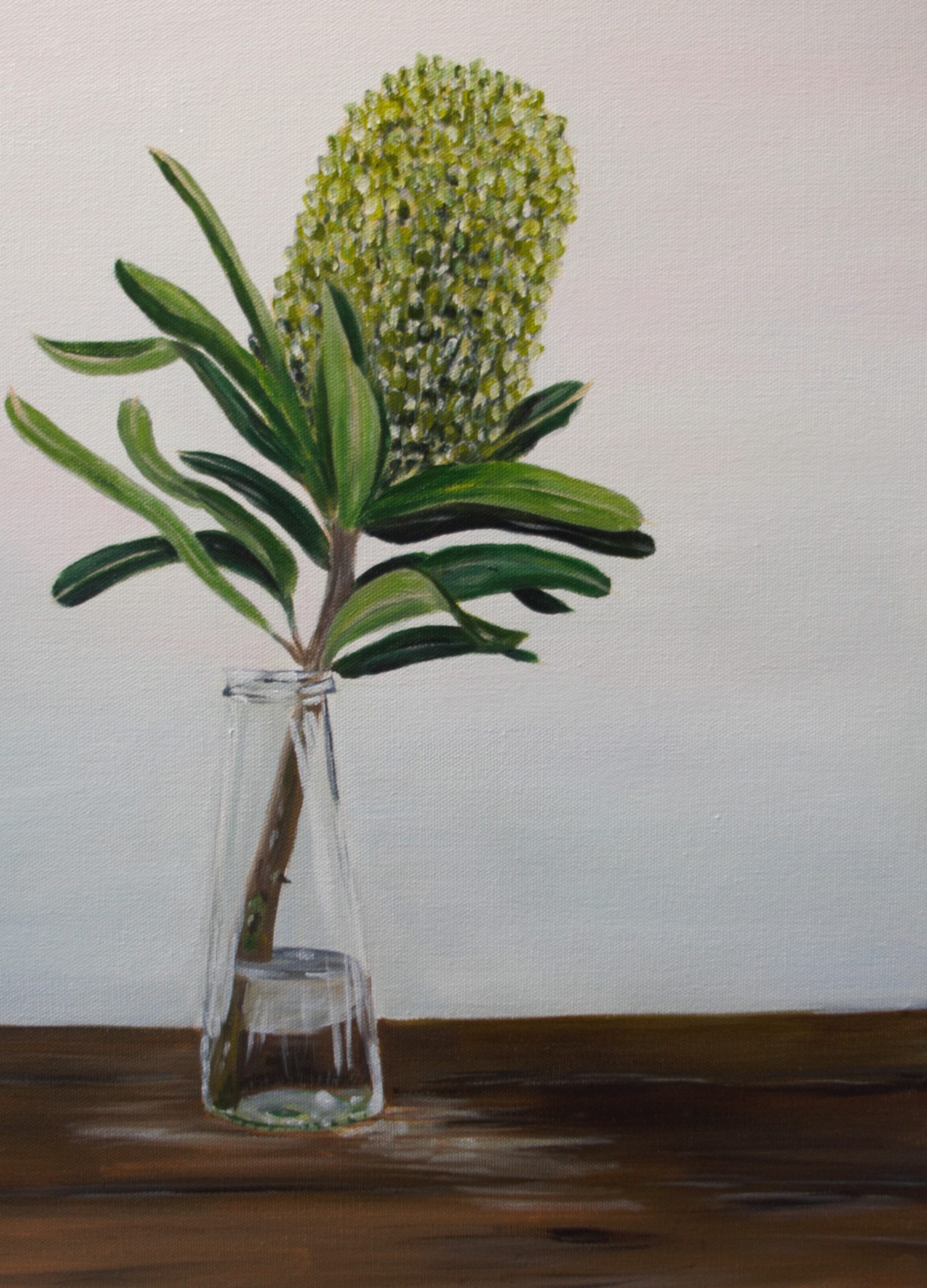 This painting is inspired by the many transitions of the quirky and beautiful Australian banksia and in the background, the subtle transitions from blue to pink and all colours in between. This represents acceptance, diversity and celebration.
