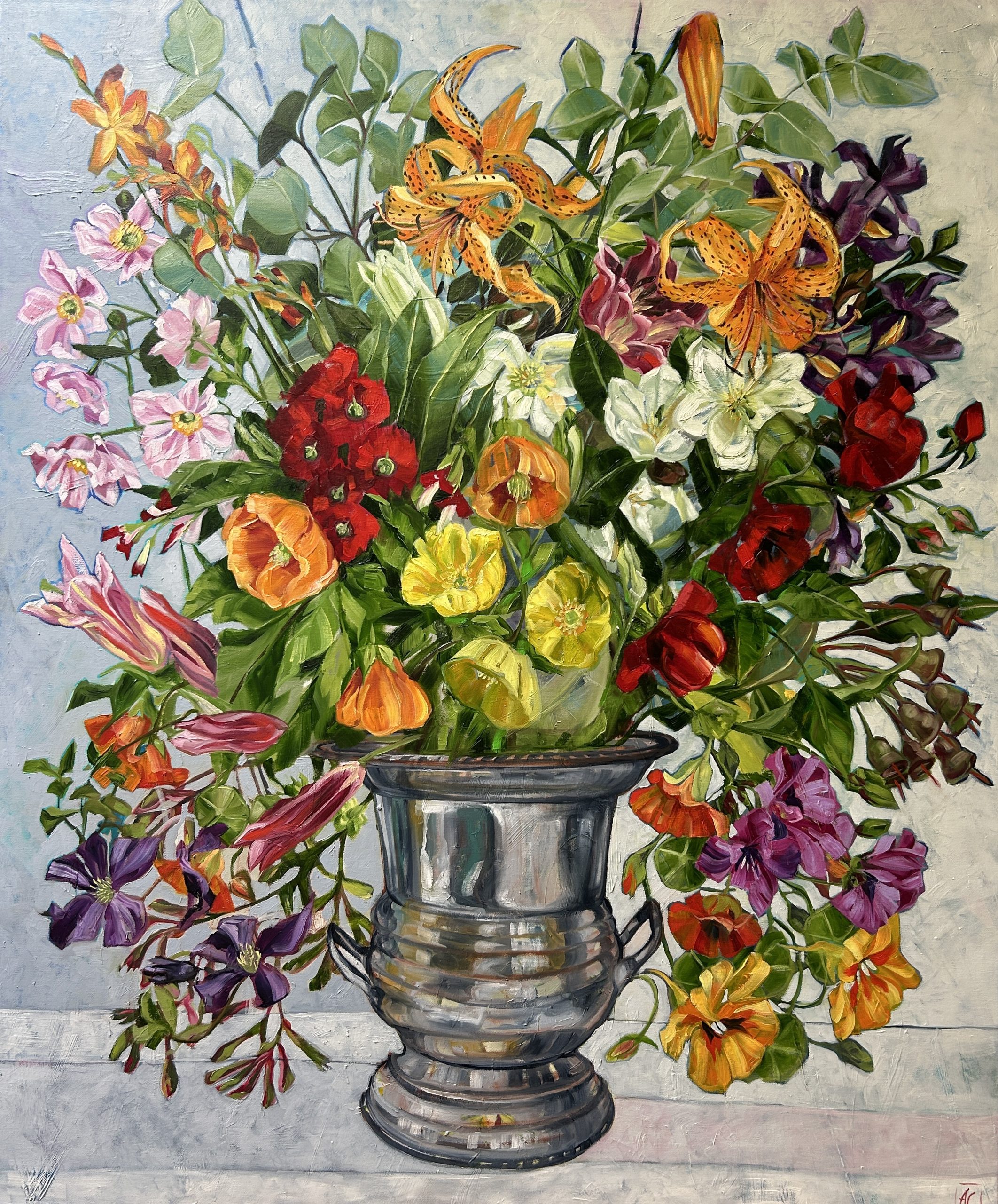 A very large still life work. Clippings of European and native florals from our 100 year old garden on top of a Victorian mountain. Placed in a vintage silver champagne bucket. A real statement piece for your home.