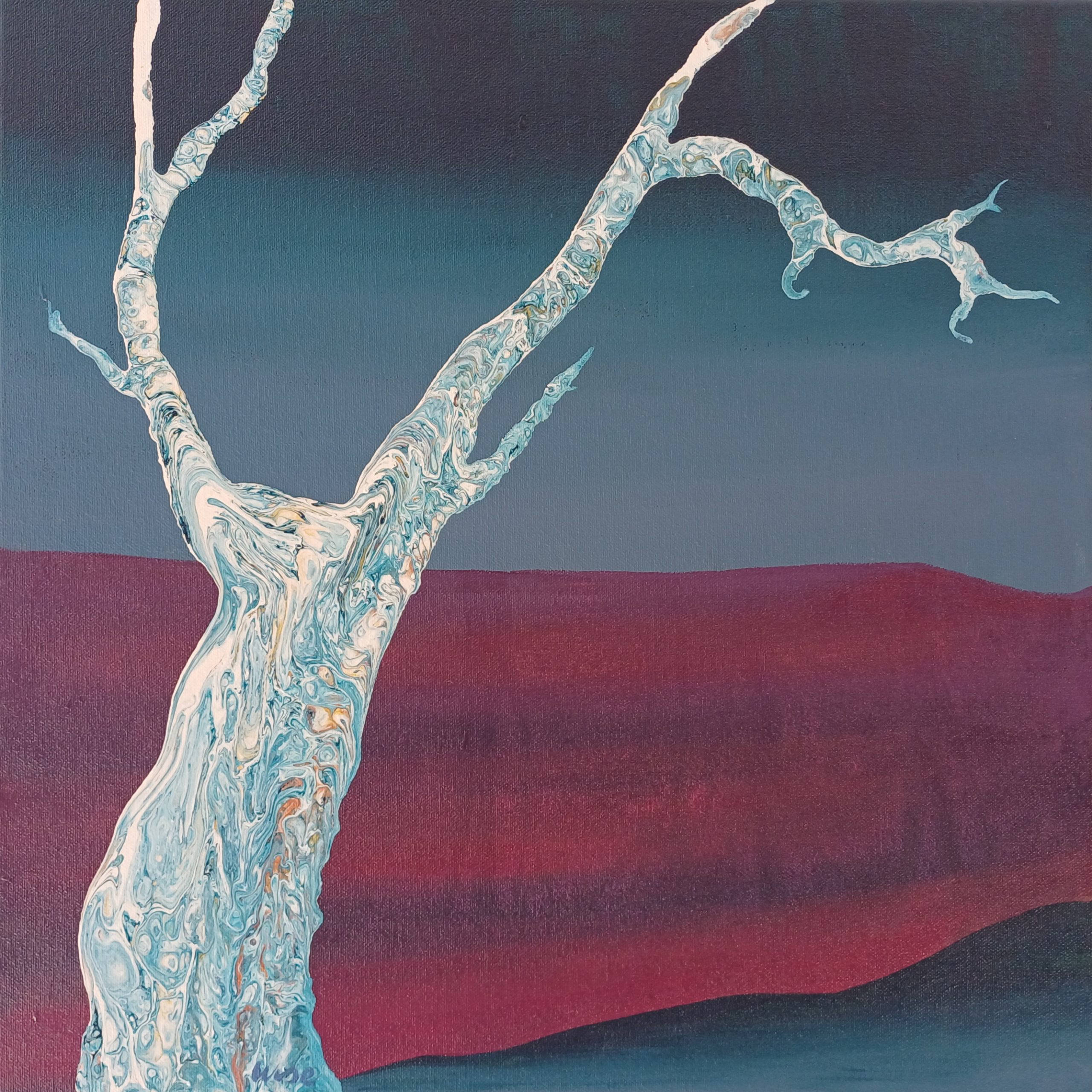 Do you notice the solitary river red gum in a paddock as you drive by? This original painting ‘Treasure 4’ by Kate Wise is the beginning of a series of paintings expanding on her ‘through the trees’ collection. Kate wants to celebrate each river red gum as a natural treasure, an old city still full of life, standing like a sentinel in an otherwise treeless paddock. Through her painting, she is saying to each tree “I see you, I appreciate you, I love you and you are important”. Each gum tree is unique in its gnarly, wizened, weather beaten beauty. Kate pours flowing acrylic paint to represent the nooks and crannies, holes and knobbly protrusions, juxtaposing this detail against soft negative space to emphasize the importance of this treasured tree.