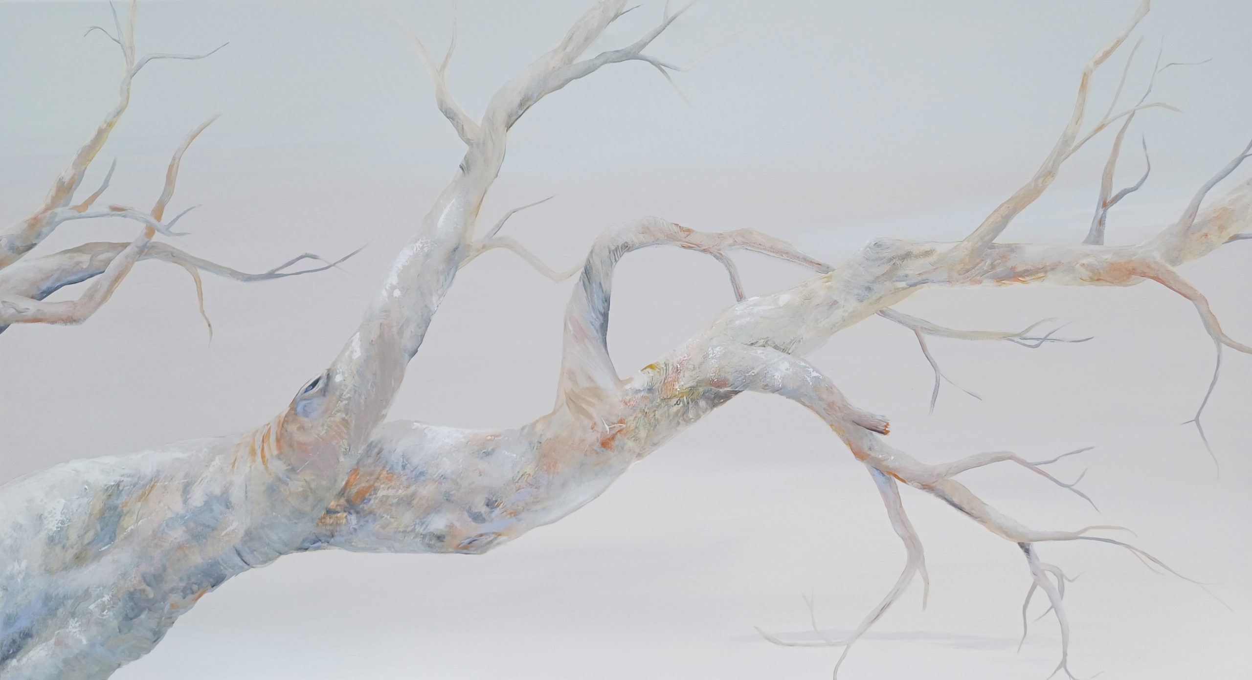 Treasure, I’m still here by Kate Wise – Kate’s gum trees, her treasures, offer her endless inspiration. On completing this painting, she asked her Instagram followers to give her words to describe it. Kate was interested in checking if people actually see what she is trying to create or have a different perspective. Her followers suggested these words: fog, spooky, ghost, stillness, reaching, calm and ethereal. Together they describe the wonderful atmosphere Kate has created in this large painting. She painted a softly gradated pale pastel sky and used a mix of brush strokes, palette knife and fluid paint pouring to represent the infinite textures of the branch. This painting is part of Kate’s ‘Treasure’ series which is her contribution to the long history of tree portraiture.