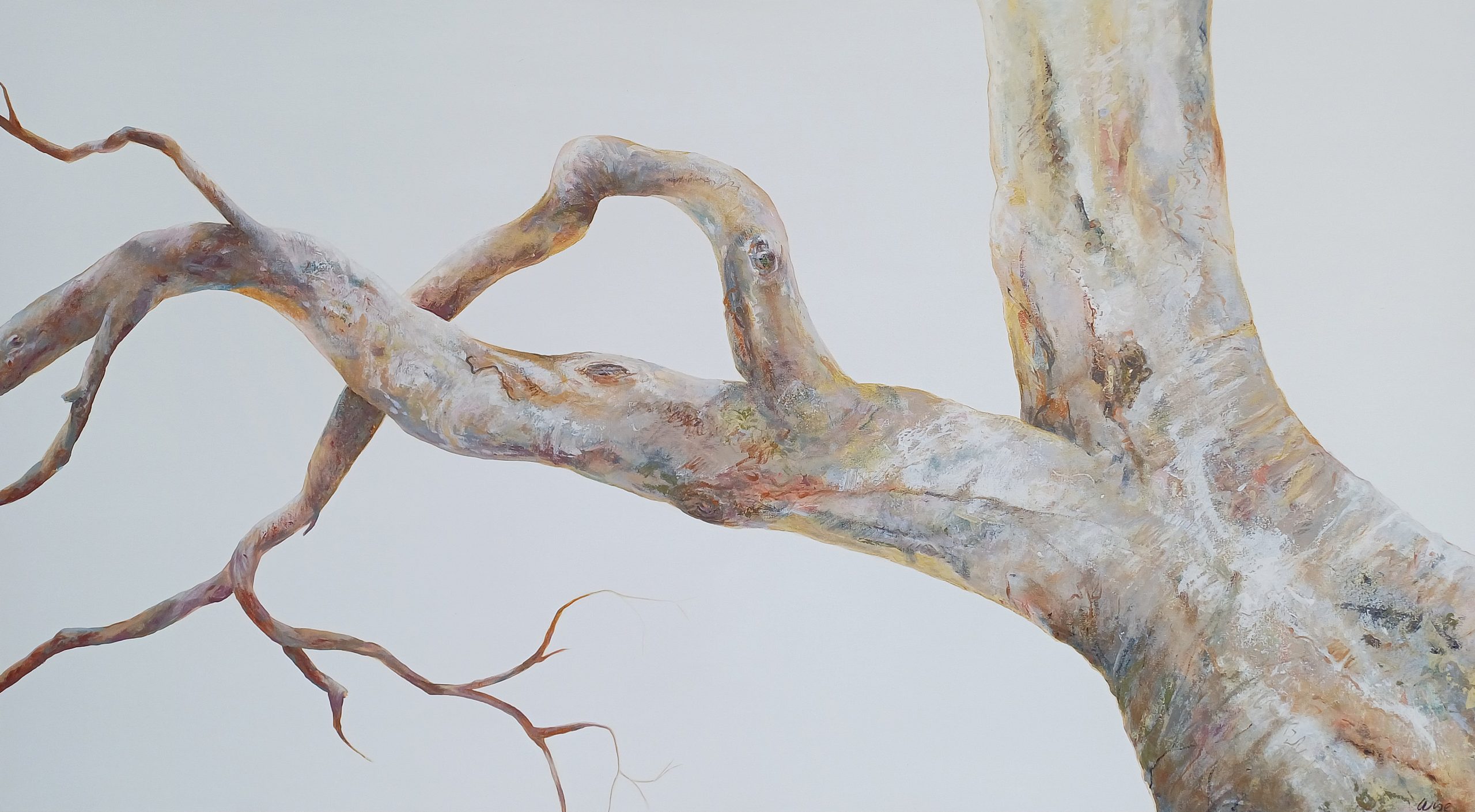Treasure, you’re always with me by Kate Wise reflects the endless inspiration she finds in her gum trees, her treasures. She has used a mix of brush strokes, palette knife and fluid paint pouring to represent the infinite textures of the trunk and branches of this river red gum. Harking back to her gum leaf and blossom paintings, Kate has given equal attention to the white negative spaces that become important shapes and patterns in the composition. There is also a glimmer of gold paint that allows the branching trunk to shine as you view the work from different angles. This painting is part of Kate’s ‘Treasure’ series which is her contribution to the long history of tree portraiture. ‘Treasure, you’re always with me’ offers nature inspired contemporary minimalism that is suitable for a large wall.