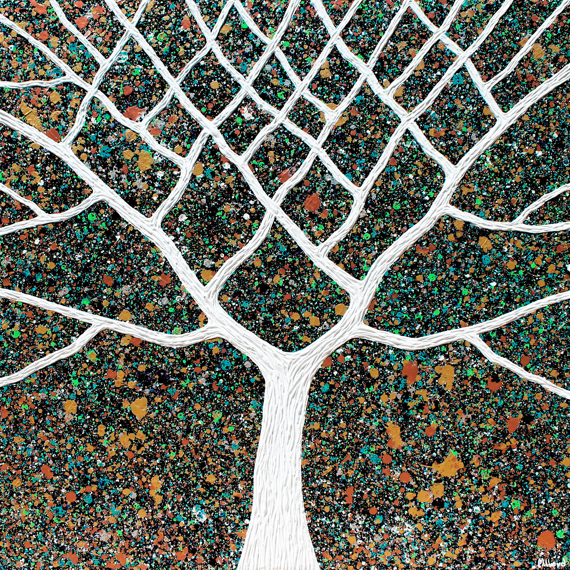 Tree – Outback Stars textured abstract by Miranda Lloyd –Â This new style of tree was inspired by my latest walk through Ansteys Hill. I wanted to capture all of natures earthy and rustic textures and colours. Once applied it also looks like a starry night. Ive used heavy metallic golds, silver and copper. Ive just started to use copper in my artworks. They compliment the blues, greens, whites and black. Tree is heavily textured and wraps around the painting with a light textured background. The close up of the truck is taken under lights in the dining room to show the gloss and metallic finish. A very striking contemporary piece for ones space.