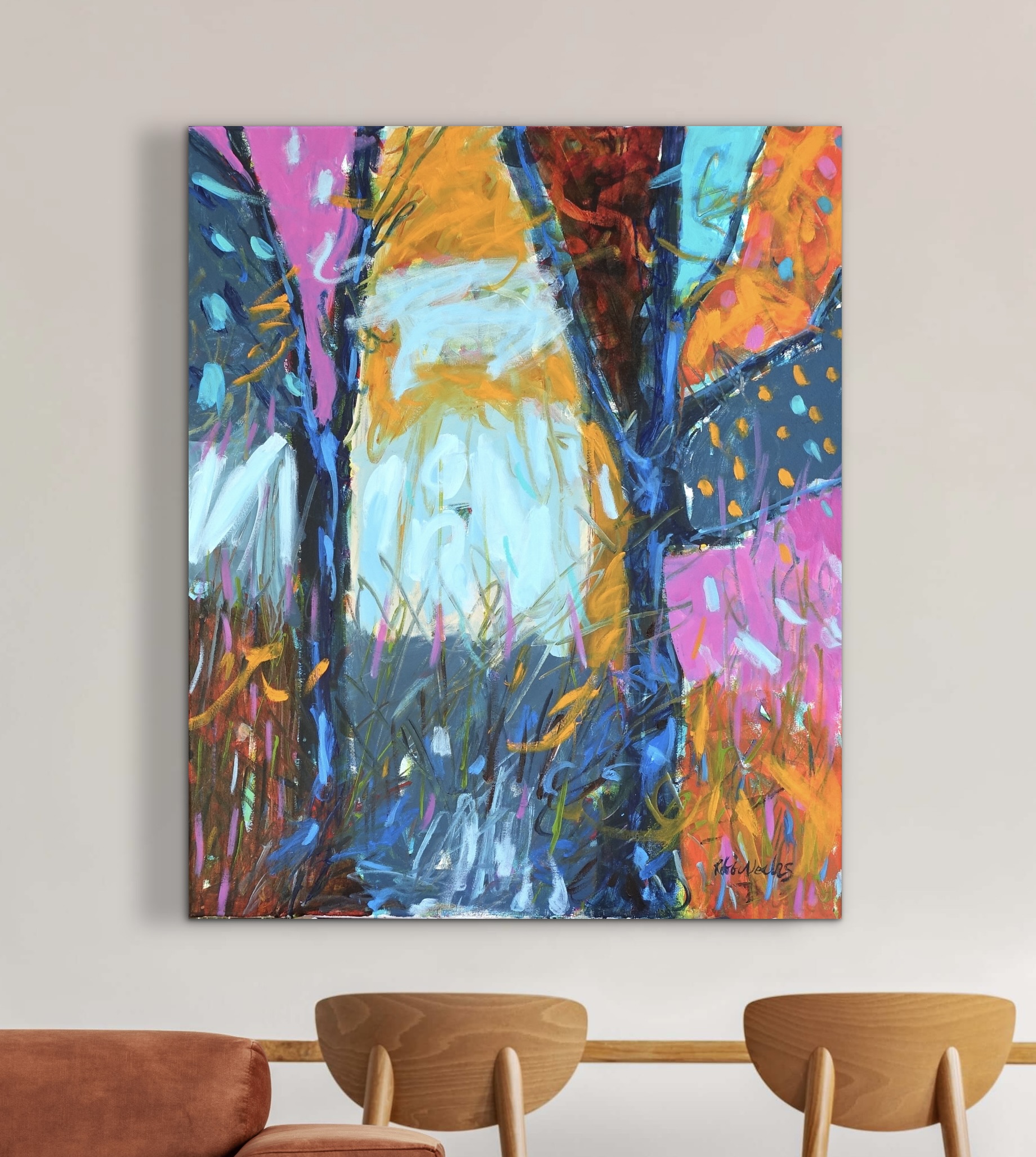 This work is sent without an exterior frame (images are to give an idea of what it would look like with an exterior frame). The work is painted on the sides (as seen in image) so that if you decide to hang it as it is without an exterior frame it will still look lovely from any angle. No ugly white sides. If adding a frame I suggest matching your home rather than the painting ie if you have a lot of timber use a timber frame etc.