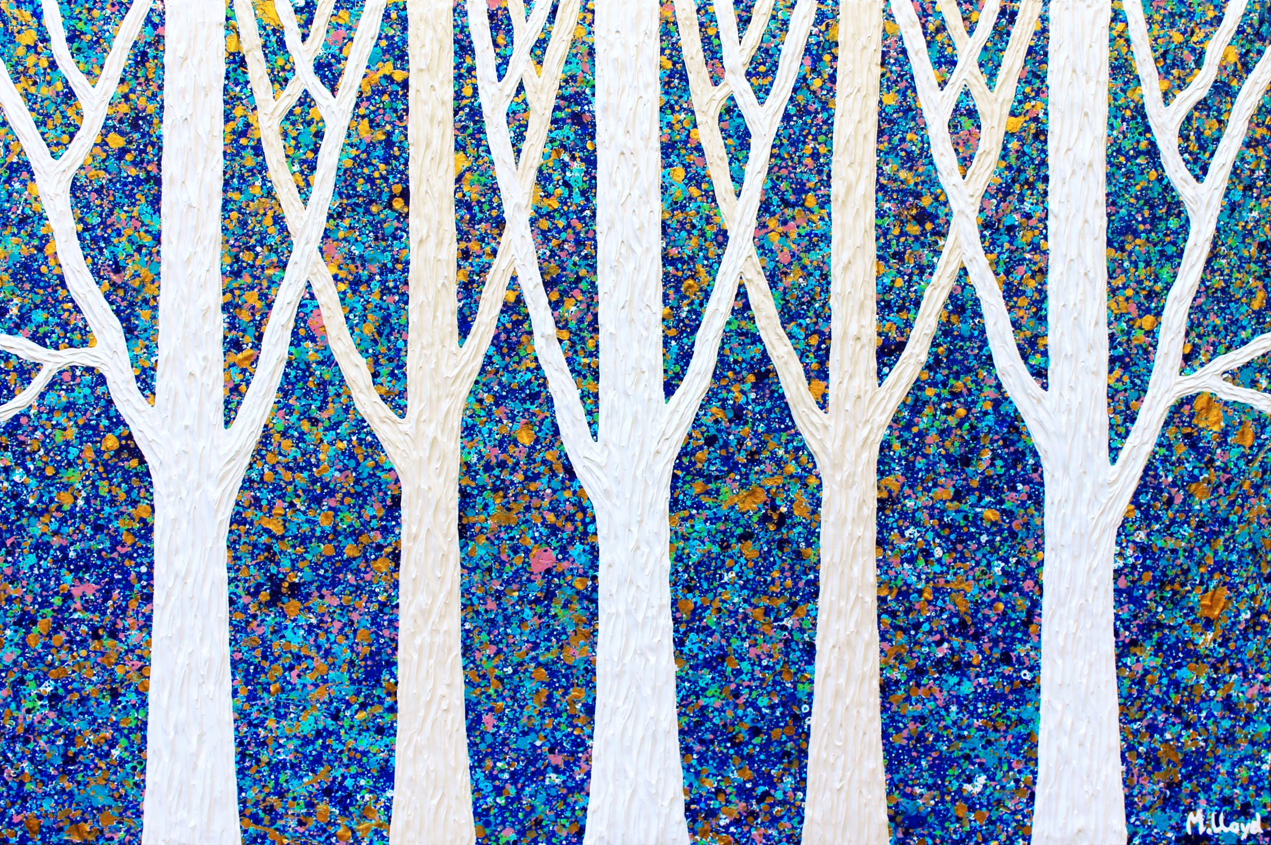 Trees Coastal Gums by Miranda Lloyd – This is a new version of gum trees in coastal deep blue hues with white and beige textured trees. Inspired by living in the Adelaide Hills and my travels through coastal Australia. Background has a light texture of deep blues, sky blues, turquoise, pinks, greens and metallic golds. View the close ups to see the textures and colours. My textural paintings always look better in real life as hard to capture their true textures in a photo.