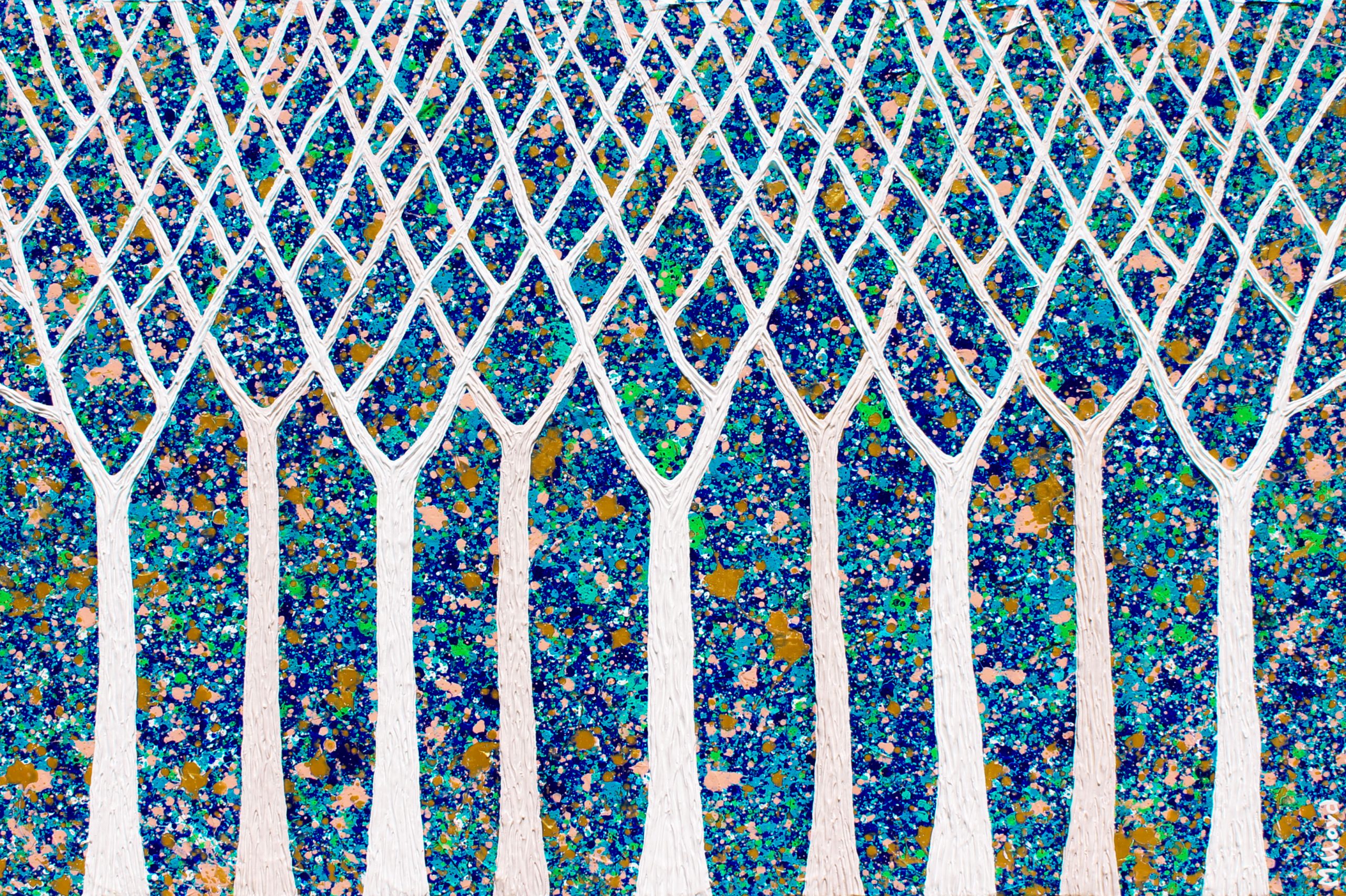 Inspired by both my love for our outback and coast. Living in the hills I am surrounded by lots of Gum trees and introduced species. I am drawn also to the beach and spend many weekends on our surf beaches. Though I live in the hills I love everything tropical and beachy that is why I paint so much art inspired by water. This painting has a textured background with hues of blues, greeny blues, pink, gold, silver and white. The trees have their own textures to create the feel of bark and a blend of whites and deep cream. View the close ups as shows their textures and gloss finish.