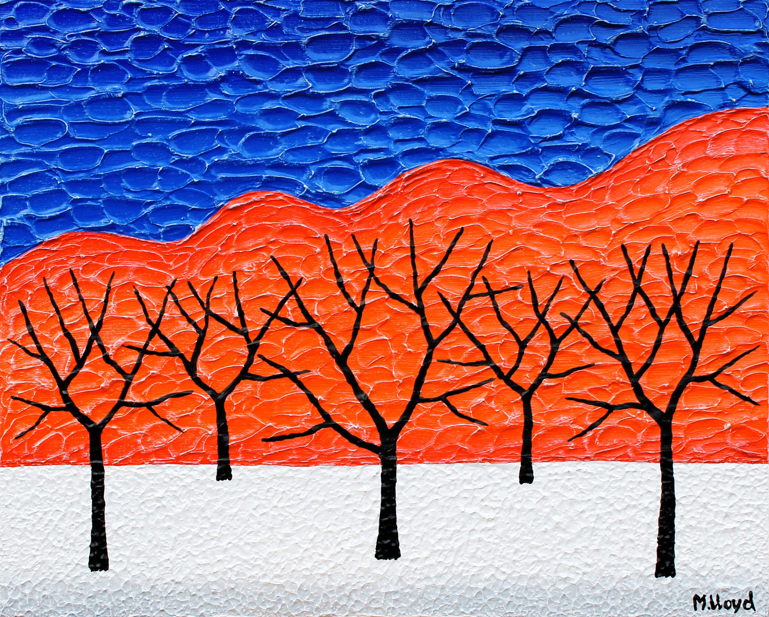SPECIAL – This is another version of my Australian Outback Trees , this one Ive used deeper blues and more branches on the trees. A very bold abstract take on our Australian Outback. Reflects my outback Australian travels through the centre of Australia and lived in the Northern Territory for 6 years. Where I experienced lots of crazy adventures. I also visited Alice Springs and camped by Uluru (Ayres Rock) and even climbed it back in the day. I love the intense blues and oranges of this painting.