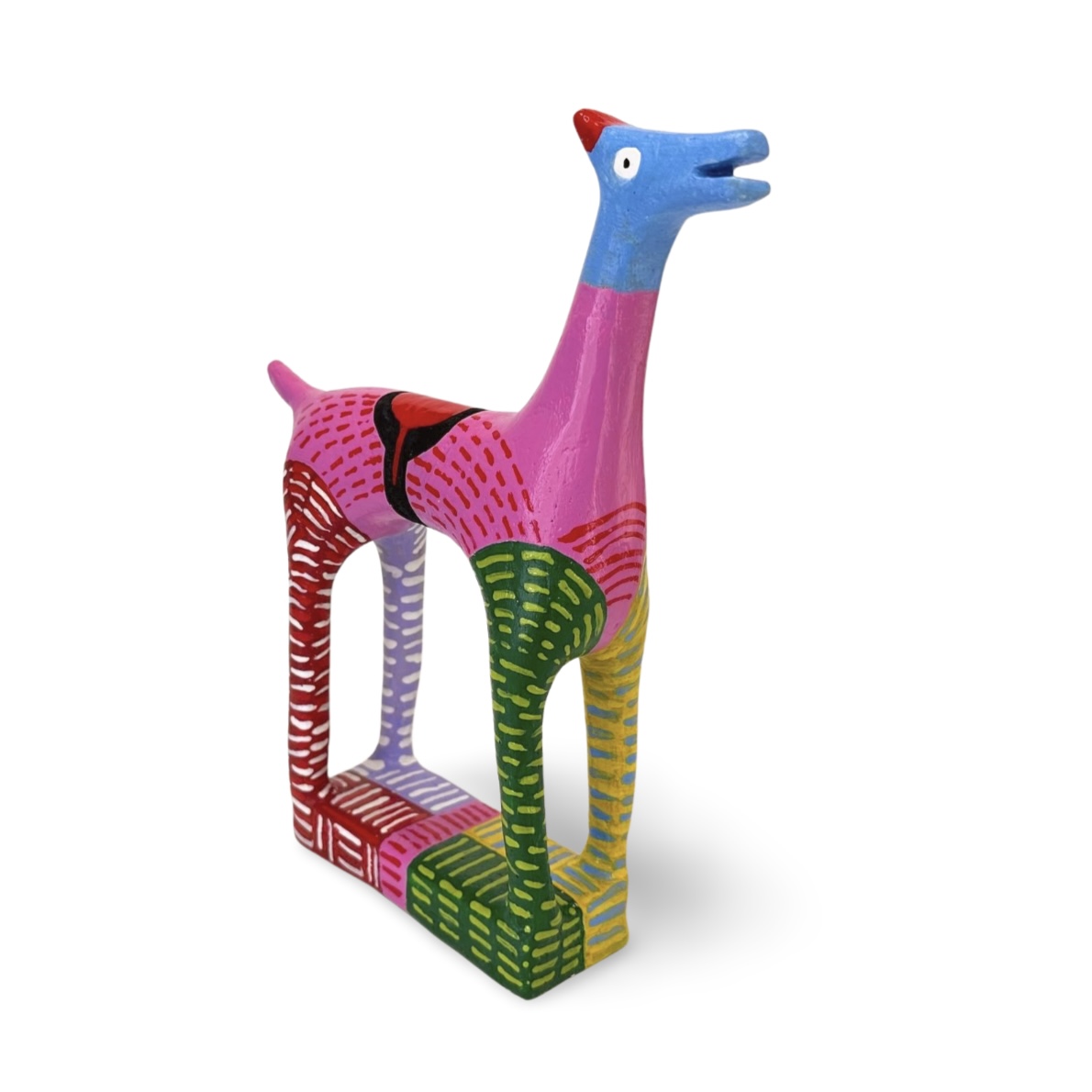 Trick Trotter by Stefan Mager – This vibrant mixed-media sculpture features a stylised horse painted in bold, contrasting colours and patterns. The piece combines whimsical elements with geometric shapes, creating playful and eye-catching art.