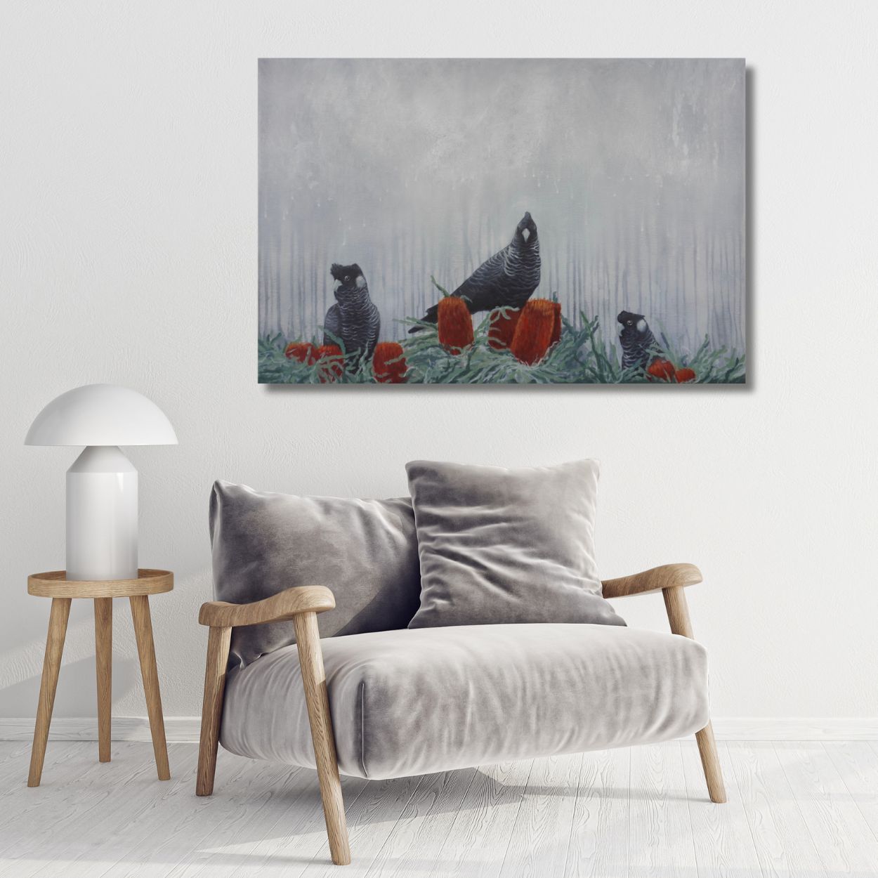 Trinity is a bold and evocative artwork featuring three Black Carnaby Cockatoos. Known not only for their striking presence, these birds are often seen as messengers between realms, carrying wisdom and guidance from ancestral spirits.