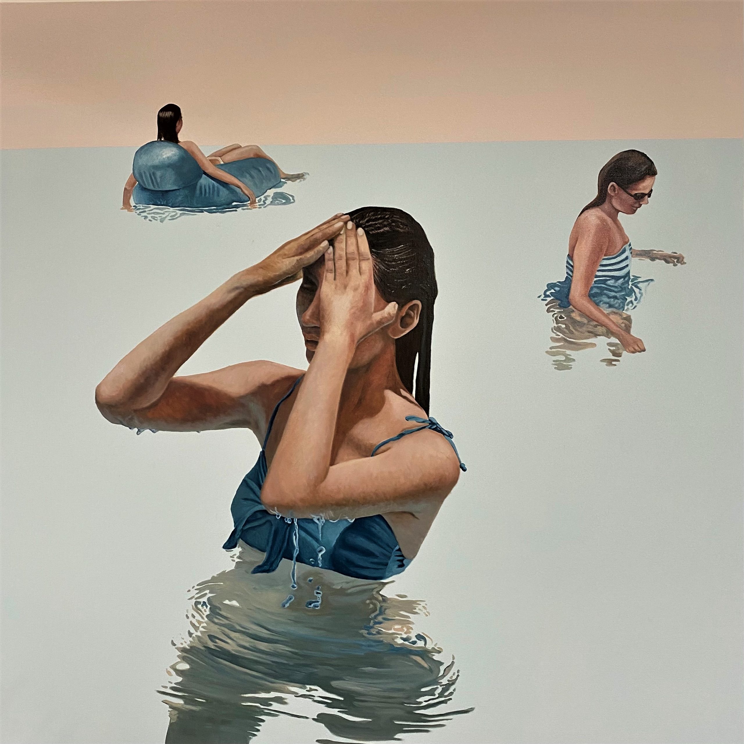 Trinity by Amanda Cameron – One of my ‘Summer Series’ of paintings and is an investigation into the interaction and connection between perspective, realism and colour. Amanda’s work is focused on the quest for finding refuge, quietness and escapism. Some [paintings] focus on the lone swimmer, the few minutes of introspection when submerged in the warm quiet of the water, and others investigate the interaction of people within various aspects of the landscape. I haven’t settled on any particular style and constantly struggle with juxtaposing hyper-realism and having a painterly quality to my art. This conflict in my paintings is what I am always trying to balance. This piece is painted in professional quality oil paints on a museum quality canvas and finished with edges painted and gloss varnish for protection. It comes with hanging wire and a certificate of authenticity.