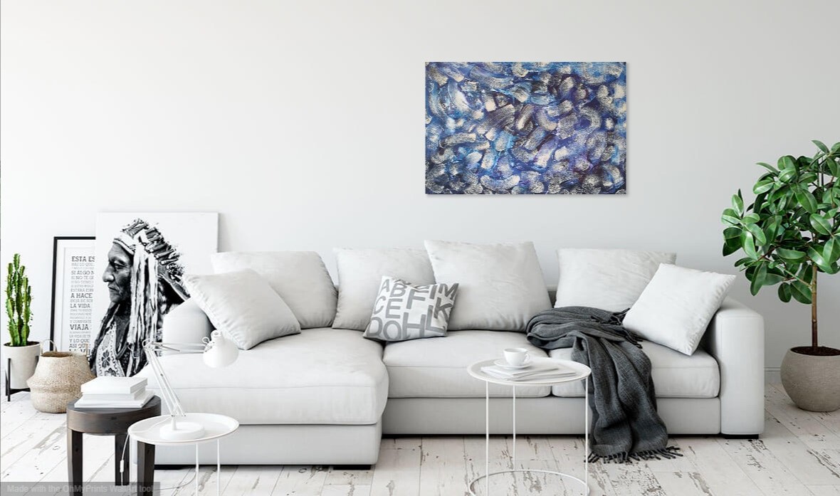 Trip the Light Fantastic by Olga Megele is seductive and dynamic. This piece dazzles with movement. Textures built up in deep violet, deep blues and paynes grey are highlighted with layers of transparent paint and antique white. Influenced by Abstract Expressionism and the gestural traditions of Op Art.