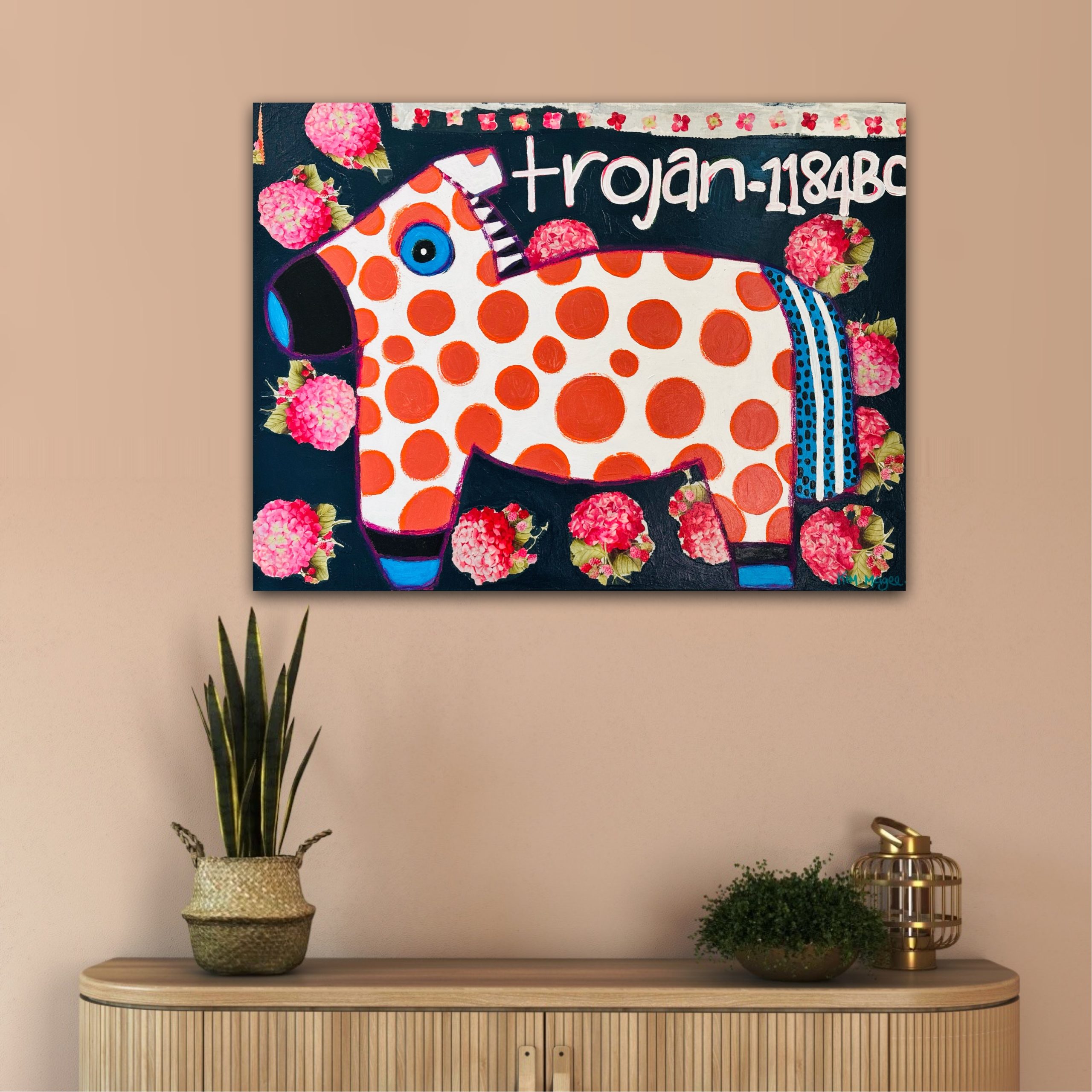 A bold and whimsical reimagining of the legendary Trojan Horse — transformed into a playful figure of orange polka dots and bright florals. The piece combines folk-art charm with modern colour energy, inviting both humour and nostalgia.