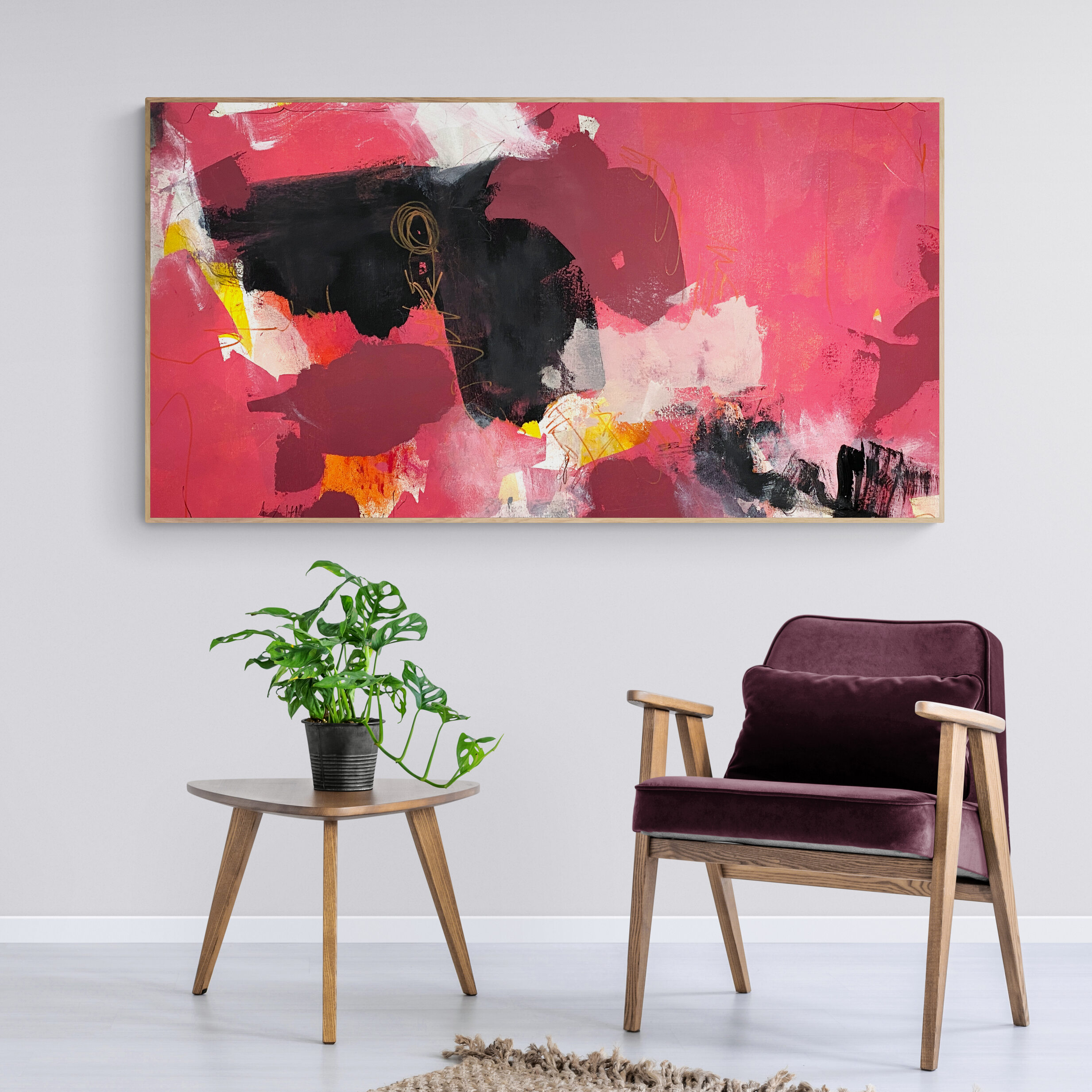 A vibrant palette of tonal pinks and reds with a splash of deep maroony black, fused with relaxing neutral hues and hints of yellow and orange that make the painting pop!